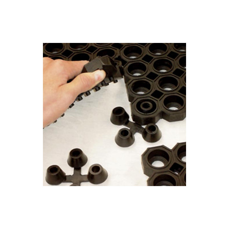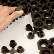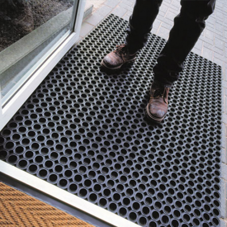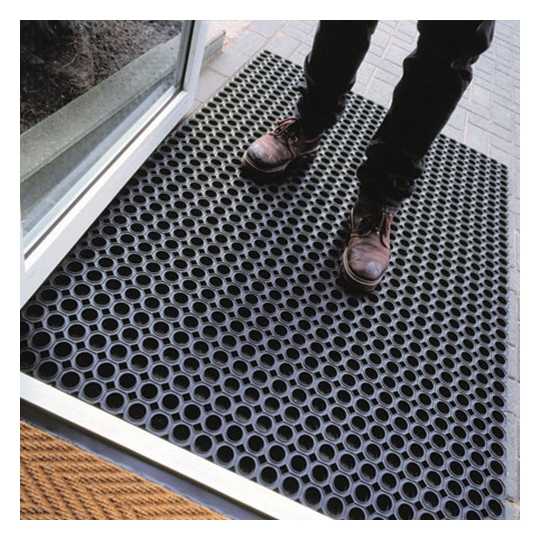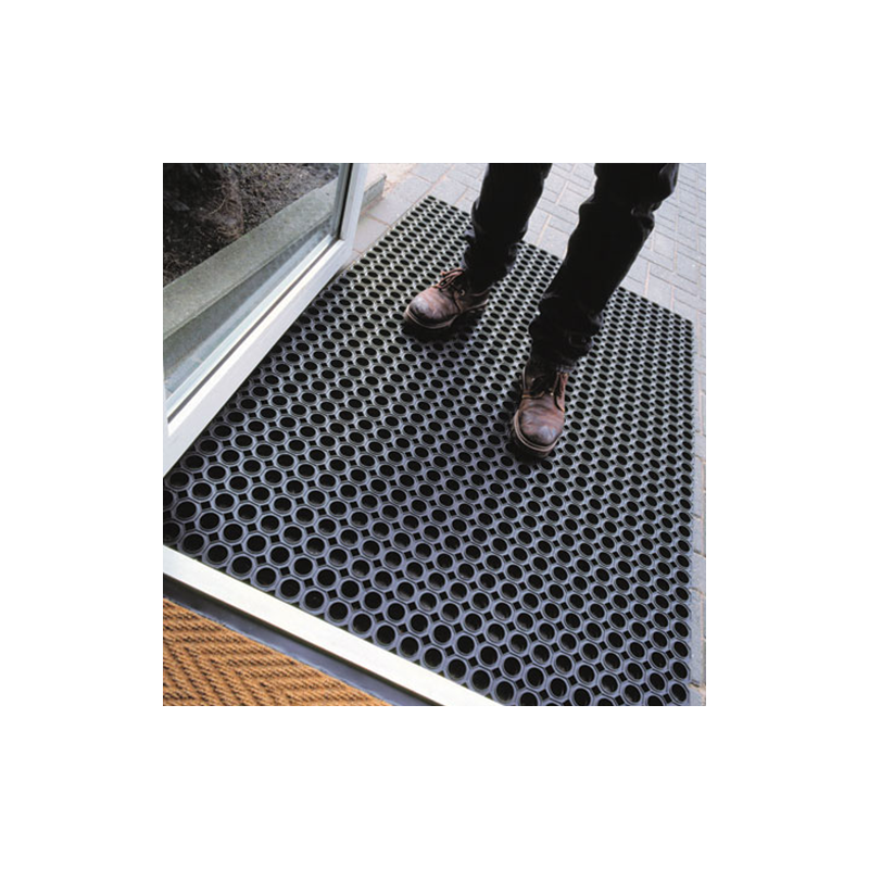 Wytrzymała gumowa mata wejściowa zbierająca błoto, brud i żwir z butów. Wypukłości pod spodem umożliwiają osuszanie, które pozwala na pozostawienie powierzchni czystej i suchej. Odporna na ekstremalne warunki pogodowe i natężony ruch pieszych. Ciężar gwarantuje, że mata leży w miejscu bez przesuwania się. Ogniwa do łączenia maty, jako dodatek.