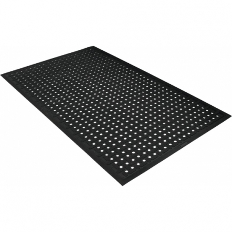Antypoślizgowa mata podłogowa o właściwościach antybakteryjnych - zapewnia przyczepność na bardzo śliskich powierzchniach, - do stosowania w przemyśle, obszarach gastronomicznych oraz zakładach produkcyjnych/przetwórstwa żywności, - wysoka odporność na smary, oleje, tłuszcze i środki chemiczne, - amortyzowana powierzchnia zwiększa komfort pracy i redukuje ryzyko stłuczenia przedmiotów, - powierzchnia „krzyżowa” zapewnia wyjątkowe właściwości antypoślizgowe, - otwory przelotowe umożliwiają skuteczne odprowadzanie rozlanych płynów. - łatwe czyszczenie – możliwość prania automatycznego. - fazowane krawędzie po każdej stronie. - materiał: 100% guma nitrylowa - wysokość produktu: 9 mm - kolor: czarny - wymiar: 0,85 m x 1,4 m,3