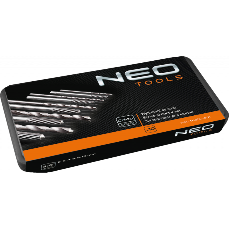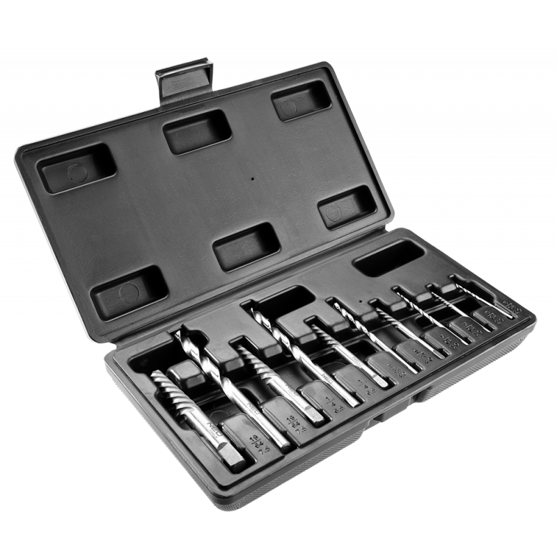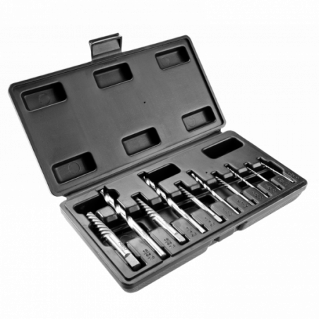 Wykrętaki do zerwanych śrub z wiertłami pilotującymi, zestaw 10 szt., rozmiary: 2, 3, 4, 6.5, 7.5 mm, stal CrMo, certyfikat TÜV M+T