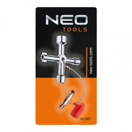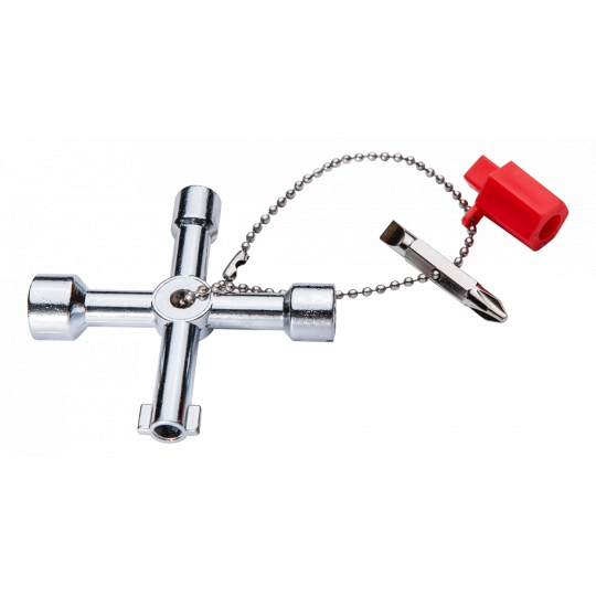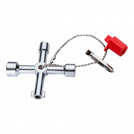 Kluczyk uniwersalny do szafek, materiał ZnAl stop cynku z aluminimu, 2 bity PH2 i SL, 4 końcówki do szafek rozmiary kwadrat 6, 8 mm, trójkąt 12 mm, kółko 6 mm.