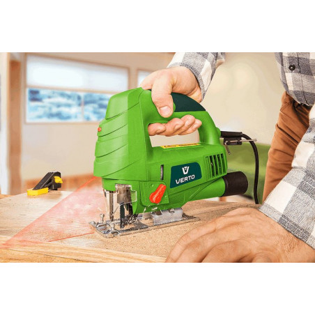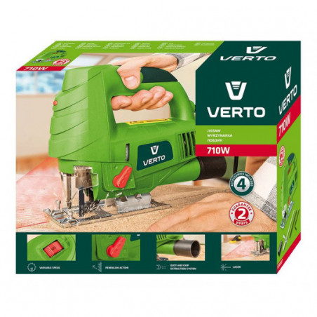 Wyrzynarka 710W, ilość suwów 0-3000 min⁻¹, kąt nachylenia stopy 0-45º w prawo/lewo, głębokość cięcia w drewnie/stali 80/10 mm, skok brzeszczotu 18 mm, ruch wahadłowy brzeszczotu 0-III, wskaźnik laserowy, (LxH) 220 x 205 mm, masa 2.1 kg, akcesoria: brzeszczot, prowadnica równoległa, króciec przyłączeniowy
