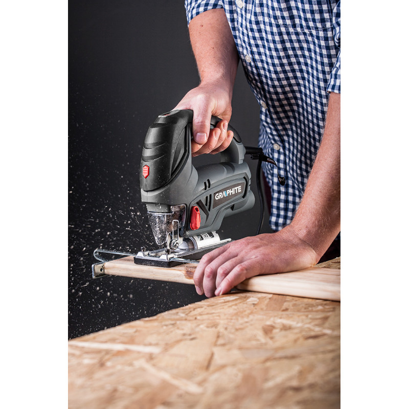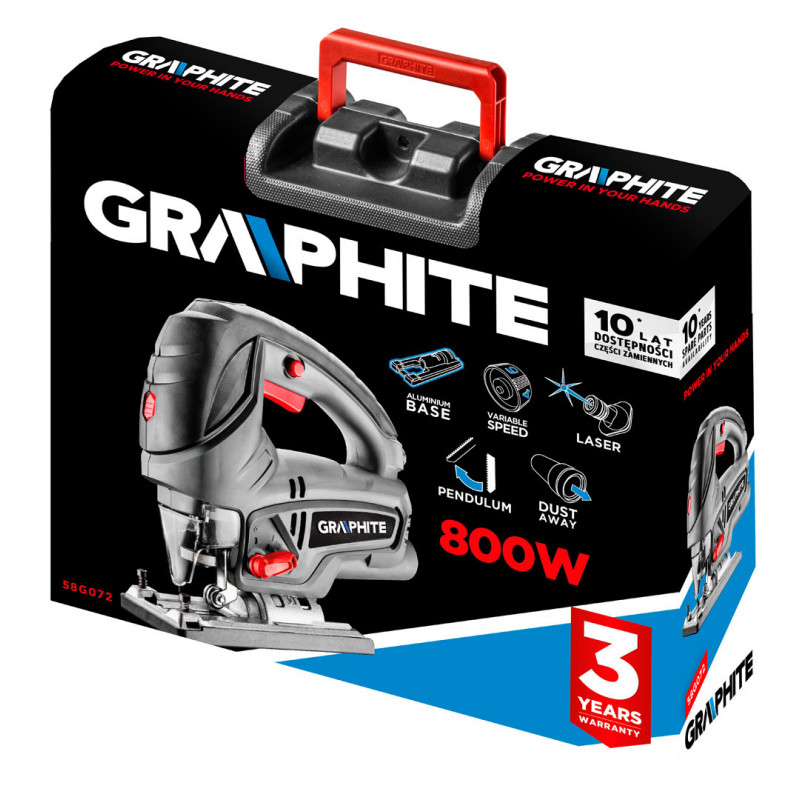 Wyrzynarka 800W, ilość suwów 500-3000 min⁻¹, kąt nachylenia stopy 0-45º. w prawo/lewo, głębokość cięcia w drewnie/stali 80/10 mm, skok brzeszczotu 20 mm, ruch wahadlowy brzeszczotu 0-III, wskaźnik laserowy, wymiary urządzenia (LxH) 230 x 225 mm, masa 2.45 kg, akcesoria: króciec przyłączeniowy, prowadnica, klucz specjalny, walizka