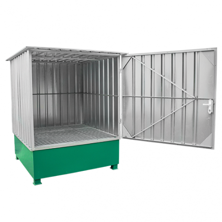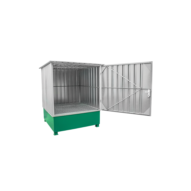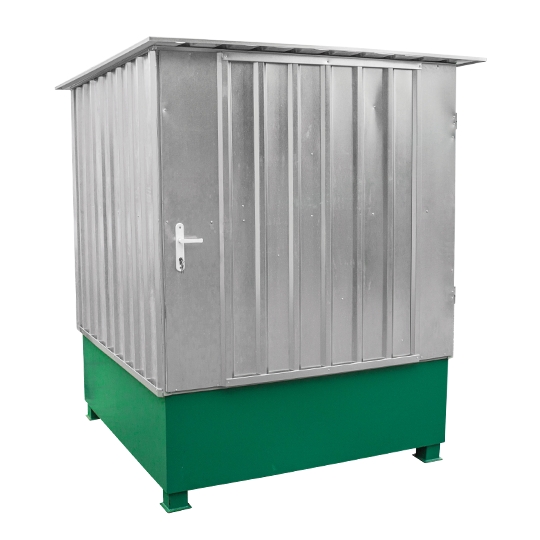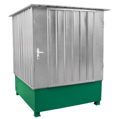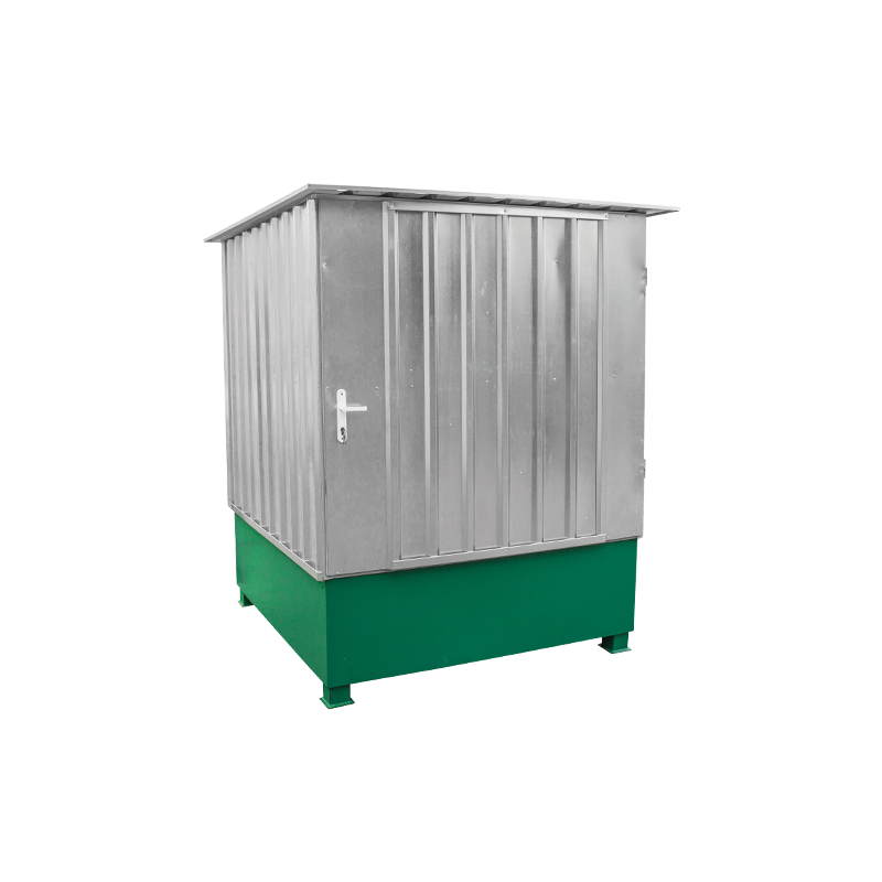 Kontener (zabudowana wanna wychwytowa) do bezpiecznego przechowywania substancji chemicznych w pojemnikach IBC (mauser). Wanna ociekowa szczelnie spawana, przeznaczona do gromadzenia płynów w razie niekontrolowanego wycieku. Opcjonalnie wyposażona w zawór spustowy. Ściany, dach oraz drzwi z blachy ocynkowanej falistej chroniące przez zgubnym wpływem warunków atmosferycznych.