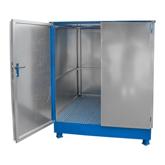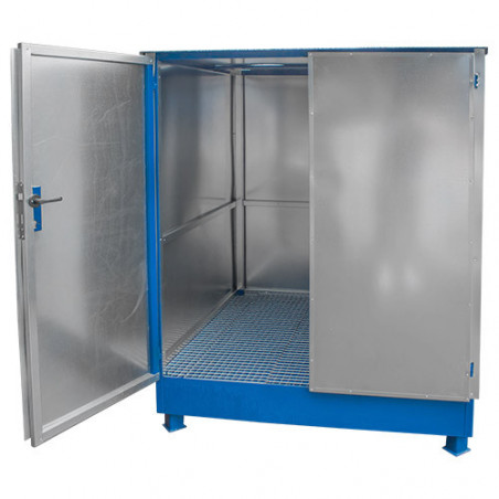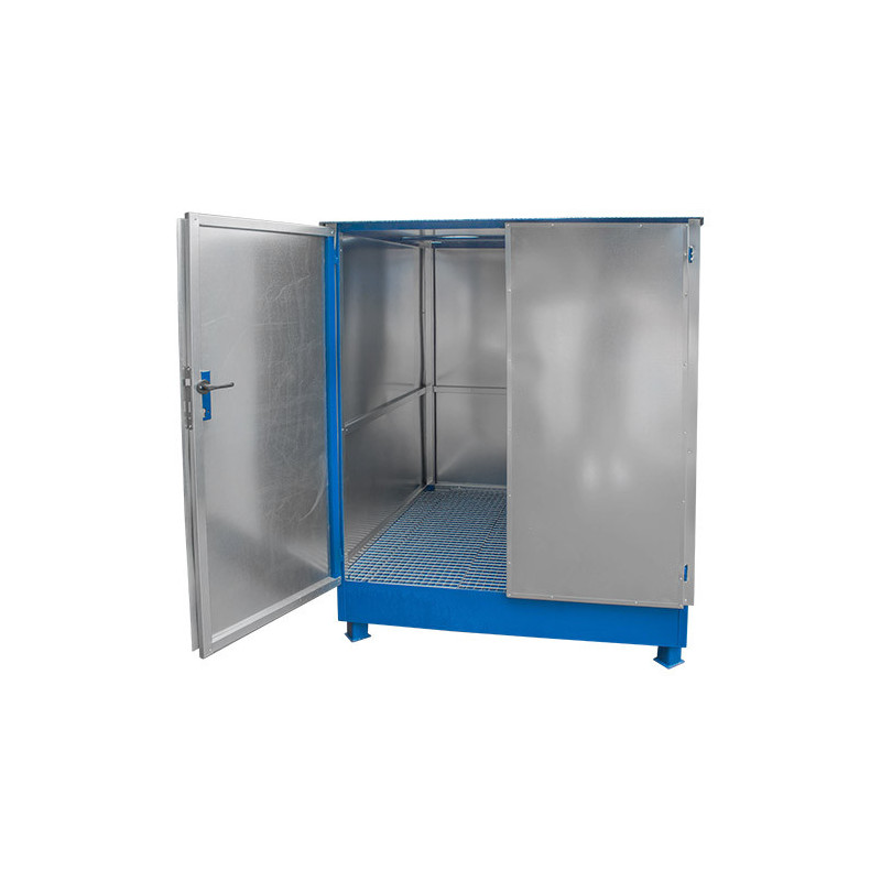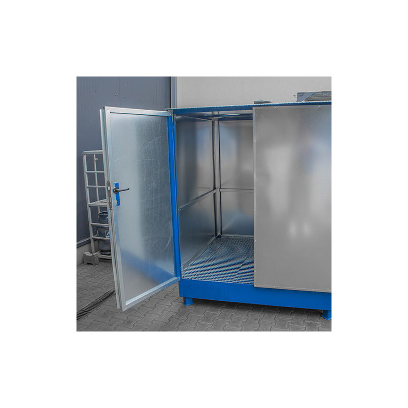 Stacja dostosowana do przechowywania substancji chemicznych, otwierana z przodu. Spawana, metalowa konstrukcja, niezwykle wytrzymała. Ściany, dach oraz drzwi wykonane z ocynkowanej blachy – całość nitowana. Możliwość wykonania z blachy ocynkowanej lakierowanej. Wszystko to ustawiono na wannie wychwytowej. Stację dostarczamy całkowicie zmontowaną i gotową do użytku. Nowoczesne rozwiązanie konstrukcyjne zapewnia łatwy i szybki transport wózkiem widłowym. Wanna ociekowa spełnia tu rolę podłogi, a zdejmowana krata ułatwia czyszczenie i wylewanie zebranych w wannie płynów. Szerokie otwory wejściowe ułatwiają ustawianie beczek na paletach. Po otwarciu istnieje możliwość montowania lejków, pomp i innych akcesoriów do beczek. Szafa przeznaczona do magazynowania materiałów silnie toksycznych. Zamykana na klucz.