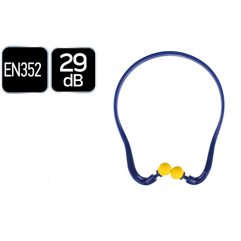 Wkładki przeciwhałasowe na pałąku, SNR 29dB, kategoria ochrony III, wkładki wykonane z pianki poliuretanowej, plastikowy pałąk pozwala na zawieszenie go na szyi, konstrukcja zatyczek umożliwia szybkie wkładanie i wyjmowanie, certyfikat CE