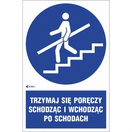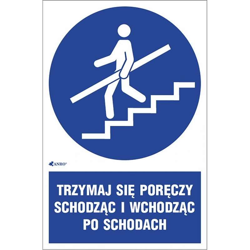 Znak „Trzymaj się poręczy schodząc i wchodząc po schodach.