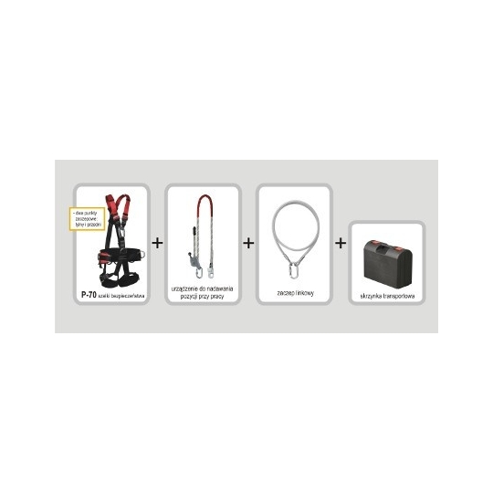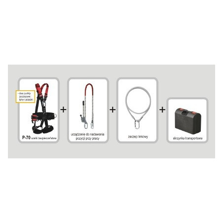 - szelki bezpieczeństwa P-70 z przednim i tylnym punktem zaczepowym, regulacją pasów udowych, pasa biodrowego i pasów barkowych w rozmiarze M-XL lub XXL