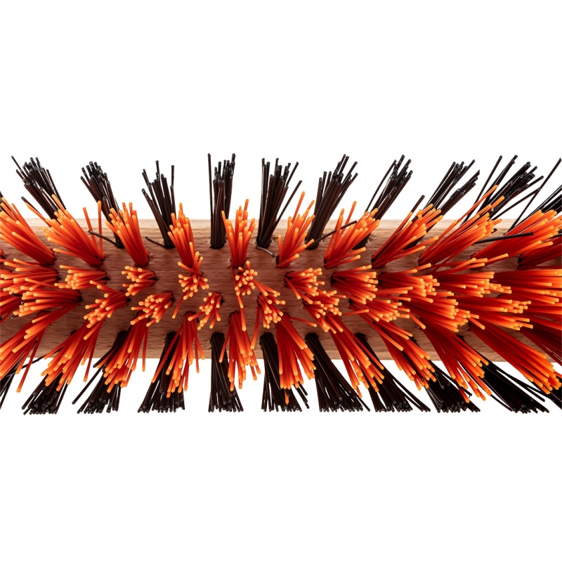 Szczotka ulicowa. Wykonana z drewna bukowego z certyfikatem FSC, włosie z PET/PCV o długości 75 mm i średnicy 0,8-0,9 mm, uchwyt z blachy ocynkowanej 2 mm. 22-24 nitki w otworze.