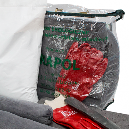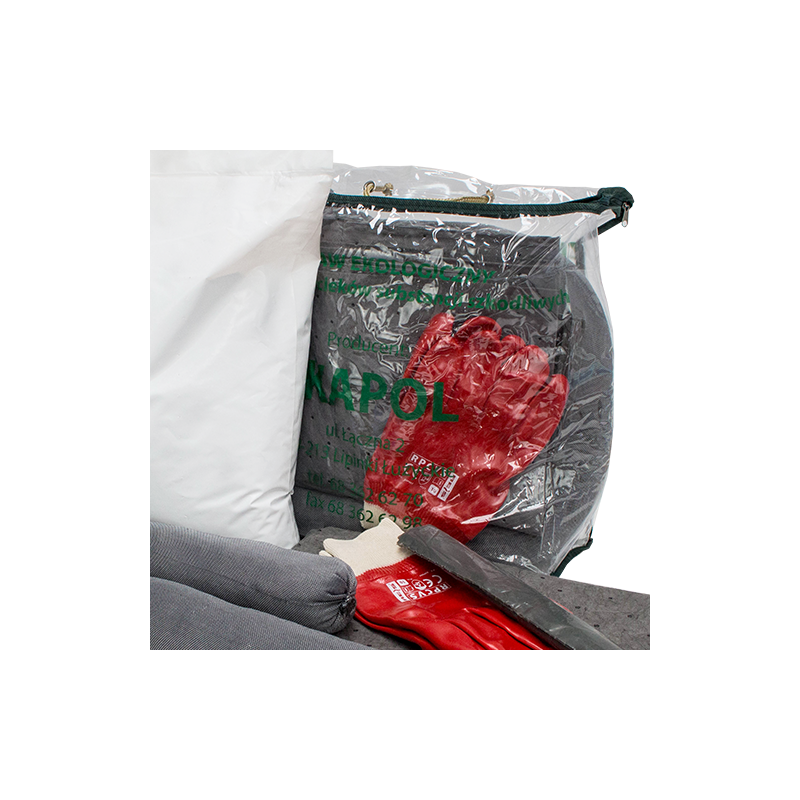 Zestaw ekologiczny umieszczony w podręcznej torbie z wydrukowaną na zewnętrznej stronie instrukcją obsługi sorbentów znajdujących się na jej wyposażeniu. Torba została wyprodukowana tak, by spełniać wymogi ADR dotyczące transportu. Podręczny kształt umożliwia łatwe przechowywanie np. w kabinie ciężarówki. Sorbenty umieszczone w zestawie pozwalają zabezpieczyć wyciek substancji niebezpiecznych o objętości do 35 litrów.