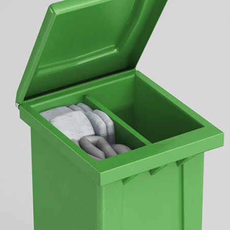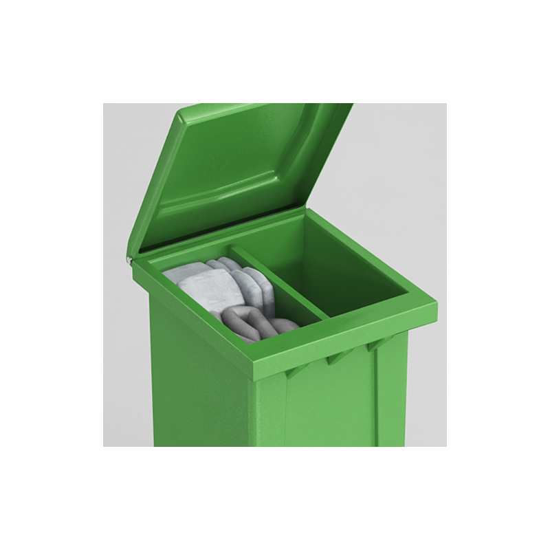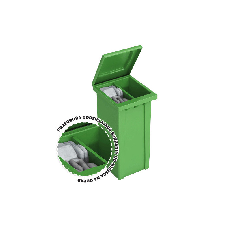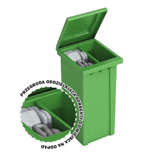 Mobilny zestaw w pojemniku dwudzielnym 240 litrów z ruchomą podziałką do szybkiego i skutecznego zbierania wszystkich rozlewisk. Ciekawe i innowacyjne rozwiązanie. Zawiera wszystko co jest potrzebne do natychmiastowej likwidacji skutków wycieku olejów, substancji ropopochodnych i innych. Możemy go zastosować na stacjach benzynowych, warsztatach samochodowych, zakładach przemysłowych i gdziekolwiek będzie potrzebny zestaw ekologiczny.