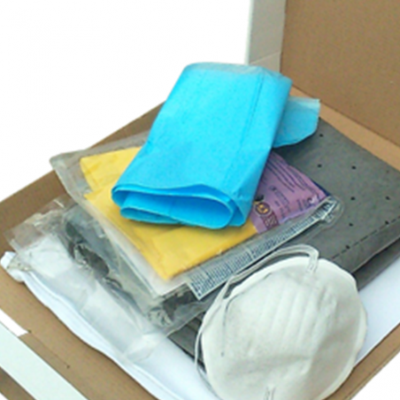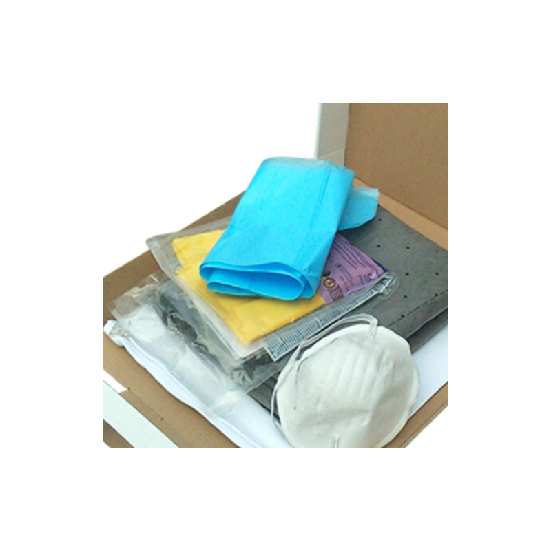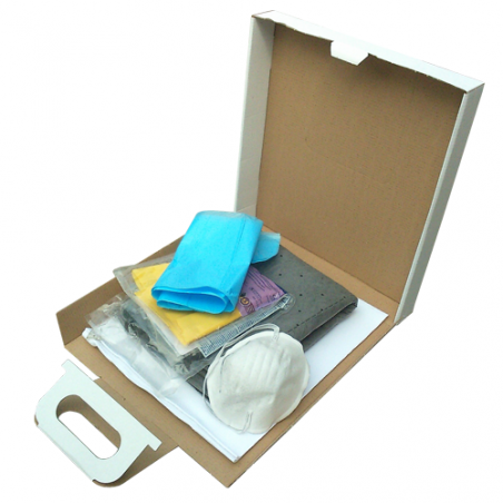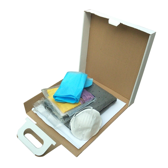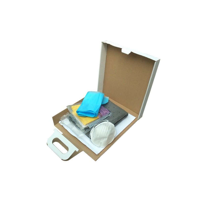 Mini zestaw do usuwania drobnych wycieków. Zestaw sorbentów w poręcznym tekturowym pudełku przeznaczony do usuwani niewielkich rozlewisk.