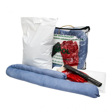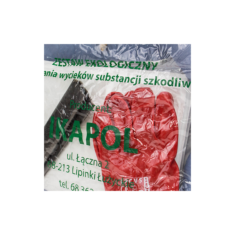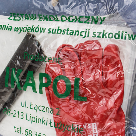 Zestaw ekologiczny dla leśników umieszczony w podręcznej torbie z wydrukowaną na zewnętrznej stronie instrukcją obsługi sorbentów znajdujących się na jej wyposażeniu. Torba została wyprodukowana tak, by spełniać wymogi ADR dotyczące transportu. Podręczny kształt umożliwia łatwe przechowywanie np. w kabinie ciężarówki. Sorbenty umieszczone w zestawie pozwalają zabezpieczyć wyciek substancji niebezpiecznych o objętości do 35 litrów. Wyposażenie zmieniamy i dostosowujemy do wymagań klientów.