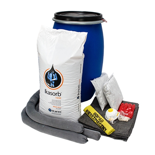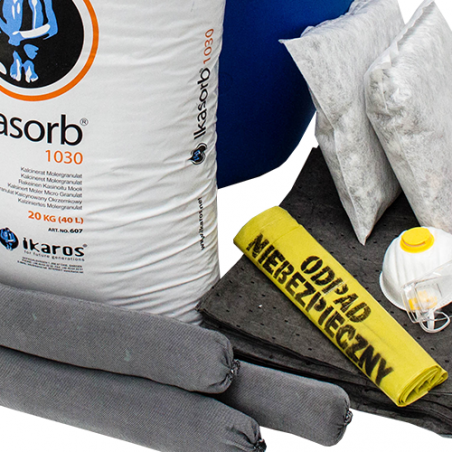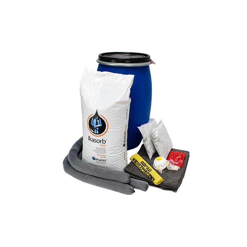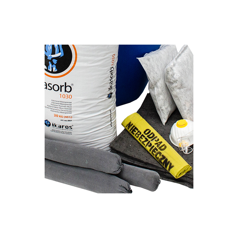 Gdy dojdzie do wypadku, wyjmij sorbenty i pozostałe materiały z tego pojemnika. Po zakończonym czyszczeniu, zbierz zużyte materiały do pojemnika, zamknij go dobrze i przekaż do utylizacji.