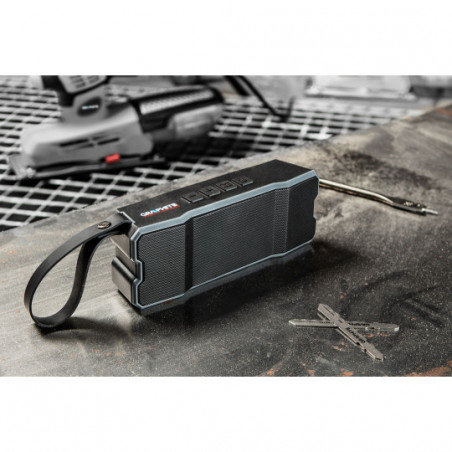 Głośnik Bluetooth z funkcją radia FM (87.5-108 MHz), moc 2x5W, akumulator Li-Ion 3.7 V/4.5 Ah, Bluetooth v4.1, zasięg do 12 m, czas użytkowania do 12 h, gniazdo ładowania microUSB 5V, port AUX, port microSD, IP65, w zestawie: przewód microUSB i przewód audio AUX (mini jack)