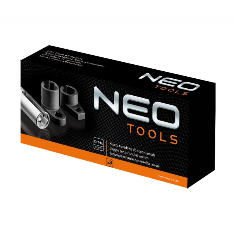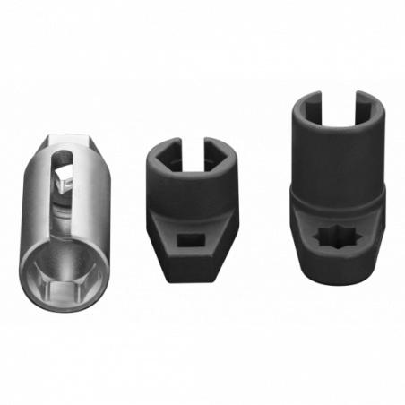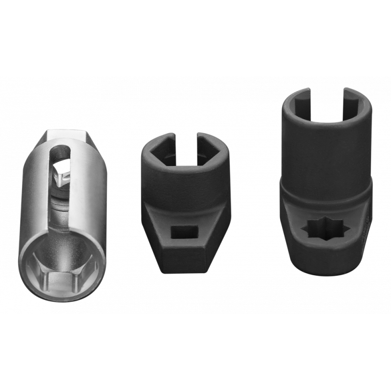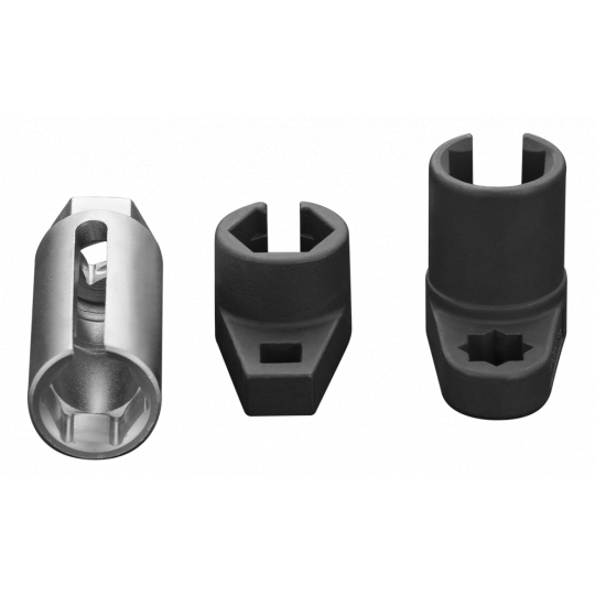 Klucze nasadowe do sondy lambda zestaw 3 szt., nasadka końcowej sondy lambda (gorącej) 1/2”, 22 mm x 50 mm, nasadka czujnika podciśnienia i sondy lambda (do sond nisko osadzonych) 3/8”, 22 mm x 30 mm, nasadka czujnika podciśnienia i sondy lambda 3/8”, 22 mm x 80 mm, stal CrV, certyfikat TÜV M+T