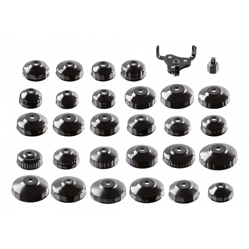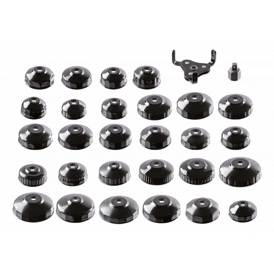 Zestaw kluczy nasadowych do filtra oleju 30 szt. Zestaw pozwala na odkręcenie filtra oleju z pojazdów marek: Fiat, Ford, Renault, Toyota, Nissan, Daichatsu, Mazda, Subaru, VW, Audi, Skoda, Seat, Mercedes, Lancia, Peugeot, Citroen, Honda, Mitsubishi, Volvo, Opel, Rover, Lexus