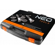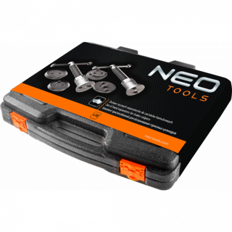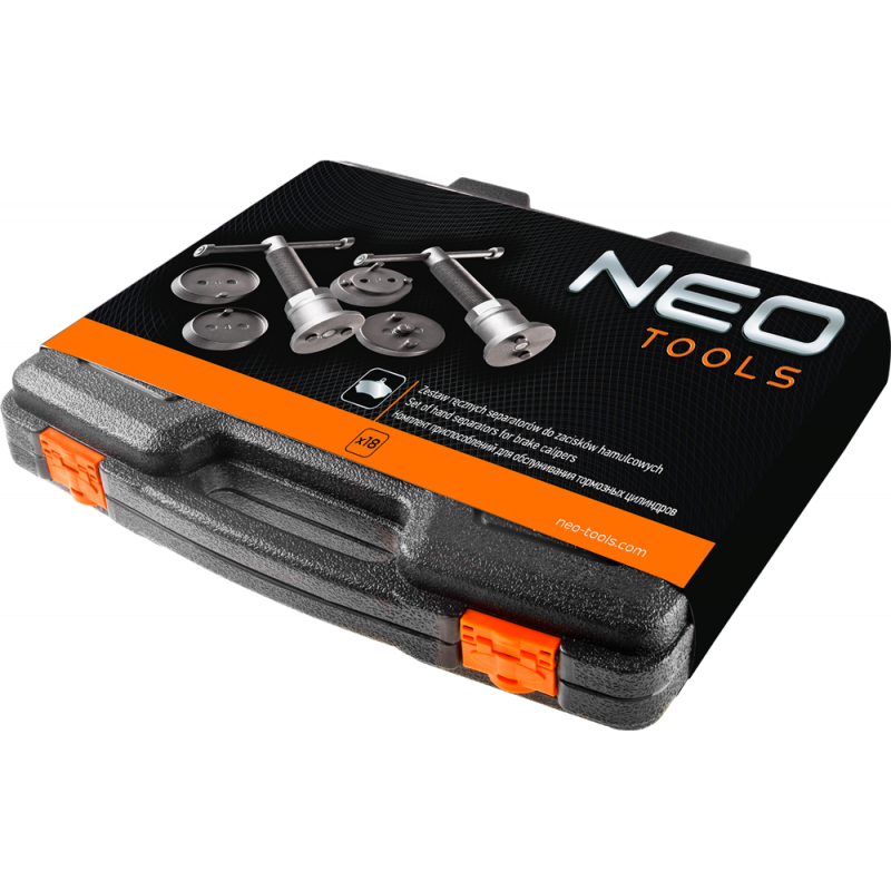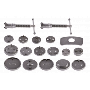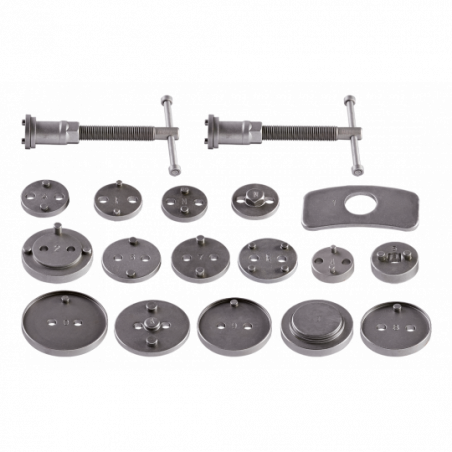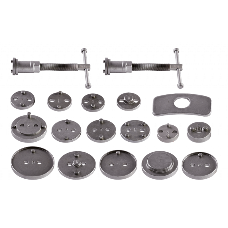 Zestaw ręcznych separatorów do zacisków hamulcowych 18 szt. Przyrząd składa się z dwóch prasek śrubowych prawoskrętnej i lewoskrętnej oraz zestawu talerzyków umożliwiających wymianę tłoczków w szerokiej gamie samochodów. Przeznaczony do samochodów: Citroen: Xm, Xantia; Alfa Romeo; Audi; Austin; BMW; Honda; Jaguar; MB; Mitsubishi; Nissan; Rover; Toyota; VW; Ford; Mazda; Subaru; Saab; Rover, GM, Peugeot, Renault, Mazda