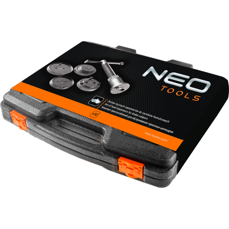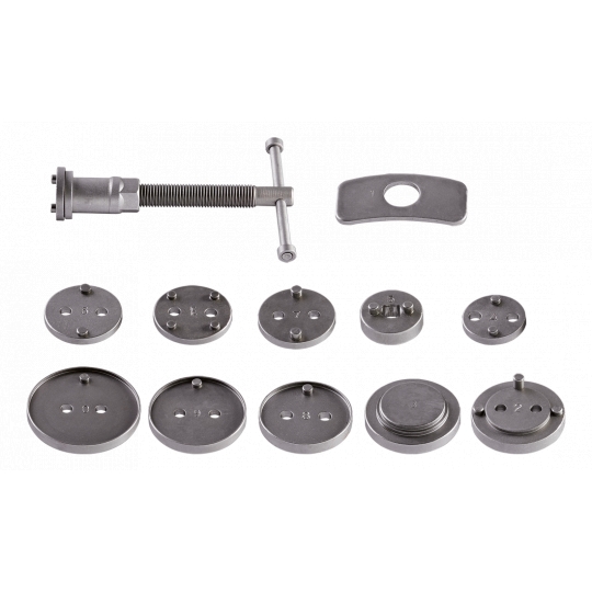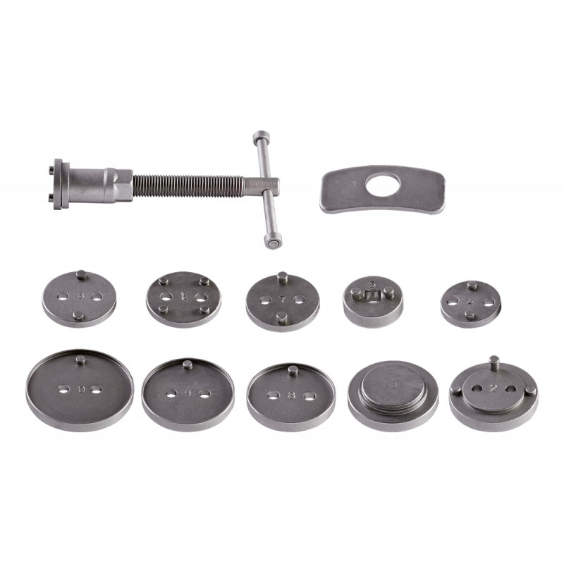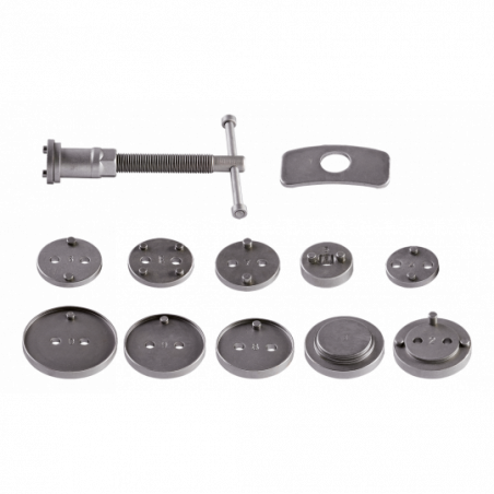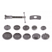 Zestaw ręcznych separatorów do zacisków hamulcowych 12 szt. Przyrząd składa się z praski śrubowej oraz zestawu talerzyków umożliwiających wymianę tłoczków w szerokiej gamie samochodów. Przeznaczony do samochodów: Citroen: Xm, Xantia; Alfa Romeo; Audi; Austin; BMW; Honda; Jaguar; MB; Mitsubishi; Nissan; Rover; Toyota; VW; Ford; Mazda; Subaru; Saab; Rover, GM, Peugeot, Renault, Mazda