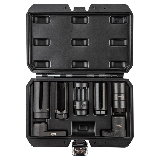 Nasadki do sondy lambda. W zestawie: 1/2" x 29 x 90 mm (wycięcie 8 mm), 1/2" x 27 x 80 mm, 3/8" x 7/8" x 90 mm (wycięcie 20 mm), 3/8" x 1-1/16" x 74 mm, 3/8" x 7/8" x 80 mm, 1/2" x 22 x 50 mm, 3/8" x 22 x 31 mm.