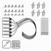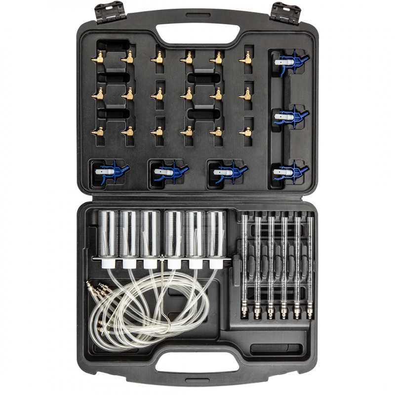 Zestaw do diagnostyki systemów Common Rail:6 szt menzurek z wężykami6 szt rurek ciśnieniowych6 złączek do systemów – Delphi6 złączek do systemów – Denso6 złączek do systemów – Siemens6 złączek do systemów - Bosch
