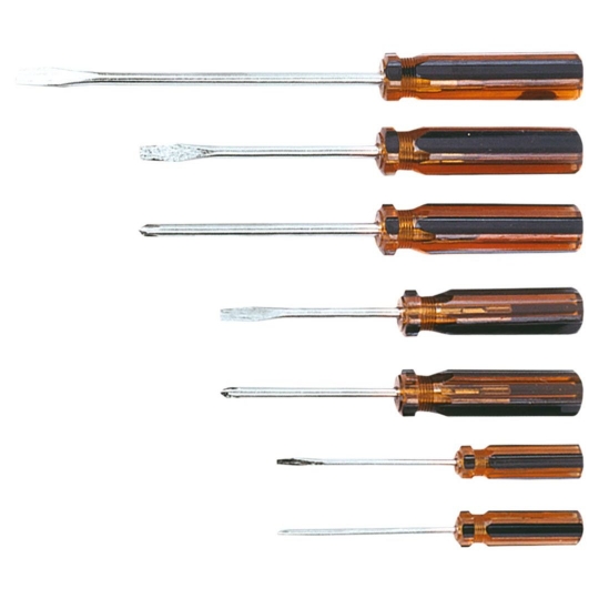 Wkrętaki, zestaw 7 szt., stal węglowa hartowana, rozmiary: płaskie 3 x 75 mm, 4 x 75 mm, 4 x 100 mm, 6 x 150 mm, PH0 x 75 mm, PH1 x 100 mm, PH2 x 100 mm
