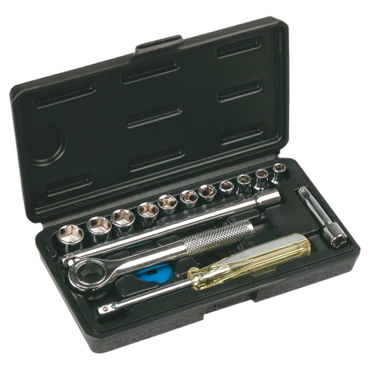 Klucze nasadowe 1/4", zestaw 16 szt., grzechotka, 2 przedłużki 50, 150 mm, uchwyt wkrętakowy do nasadek, 11 szt. nasadek, rozmiary: 4, 4.5, 5, 5.5, 6, 7, 8, 9, 10, 11, 12 mm, uchwyt obrotowy
