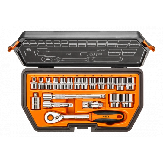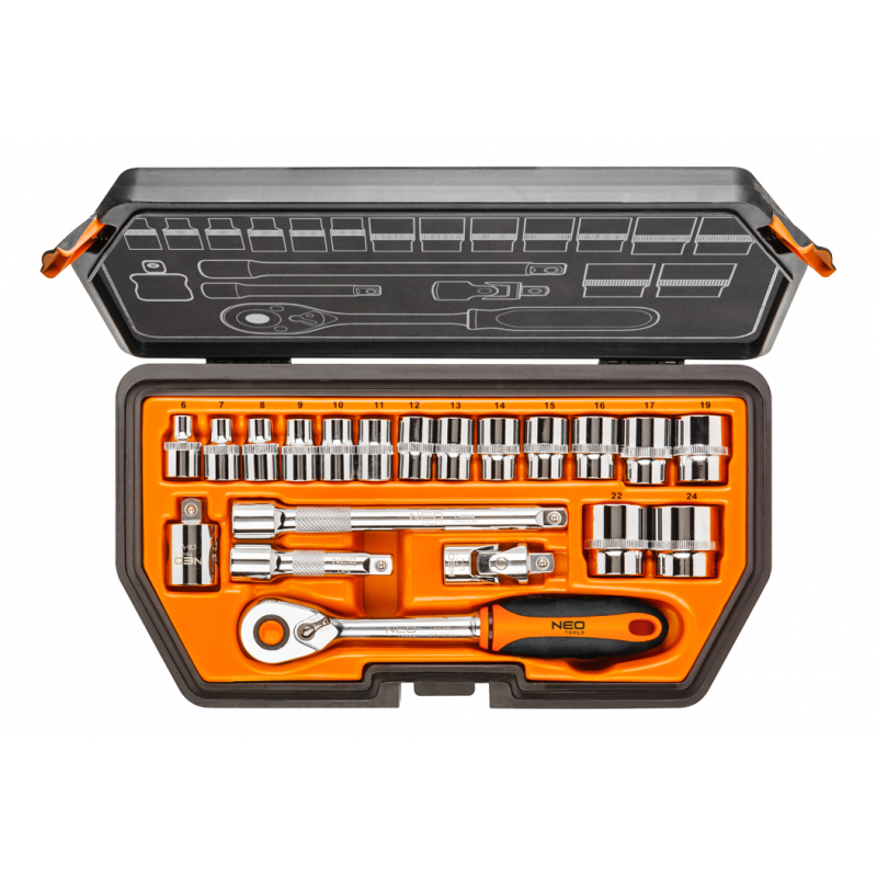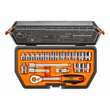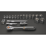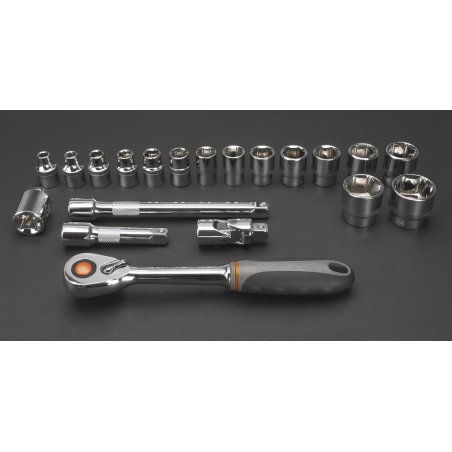 Klucze nasadowe 3/8", zestaw 20 szt., grzechotka 195 mm, 48 zębów, przełącznik kierunku obrotów, 2 szt. przedłużek 75, 150 mm, przegub uniwersalny 50 mm, redukcja 3/8"M x 1/2"F, 15 szt. nasadek sześciokątnych, rozmiary: 6, 7, 8, 9, 10, 11, 12, 13, 14, 15, 16, 17, 19, 22, 24 mm, stal CrV, walizka z tworzywa, certyfikat TÜV M+T, 25 lat gwarancji