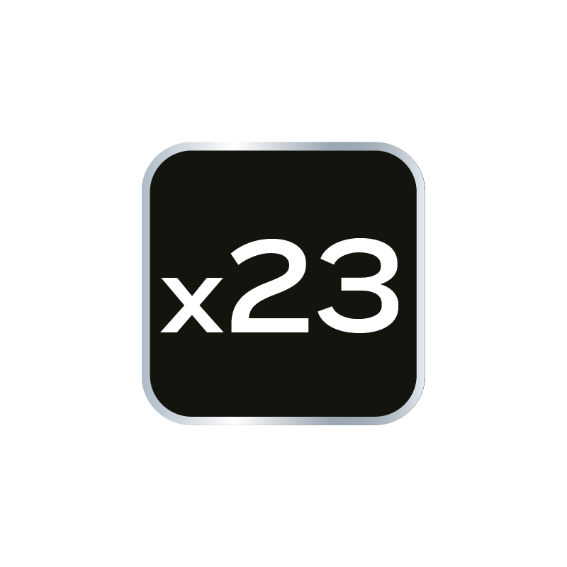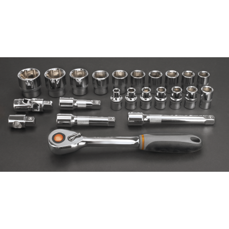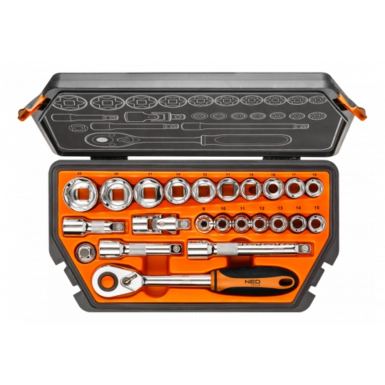 Klucze nasadowe 1/2", zestaw 23 szt., grzechotka 245 mm, 48 zębów, przełącznik kierunku obrotów, 3 szt. przedłużek 75, 100, 150 mm, przegub uniwersalny 65 mm, redukcja 1/2"M x 3/8"F, 17 szt. nasadek sześciokątnych, rozmiary: 8, 10, 11, 12, 13, 14, 15, 16, 17, 18, 19, 21, 22, 24, 27, 30, 32 mm, stal CrV, walizka z tworzywa, certyfikat TÜV M+T, 25 lat gwarancji