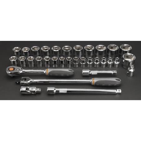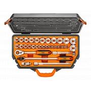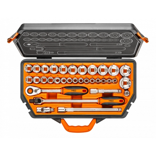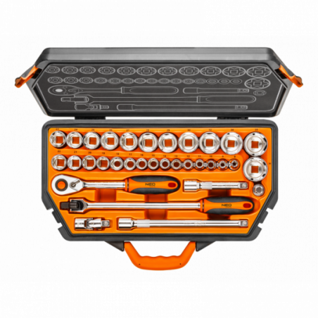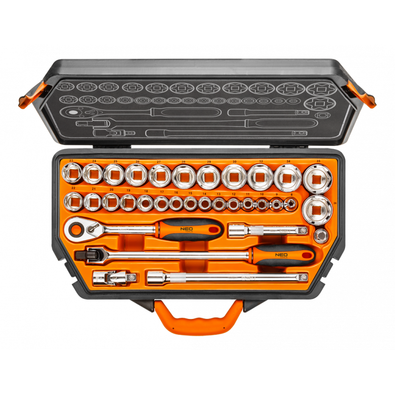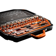 Klucze nasadowe 1/2", zestaw 33 szt., grzechotka 245 mm, 48 zębów, przełącznik kierunku obrotów, rękojeść z przegubem 370 mm, 2 szt. przedłużek 125, 250 mm, przegub uniwersalny 65 mm, redukcja 1/2"M x 3/8"F, 27 szt. nasadek sześciokątnych, rozmiary: 8, 9, 10, 11, 12, 13, 14, 15, 16, 17, 18, 19, 20, 21, 22, 23, 24, 25, 26, 27, 28, 29, 30, 32, 34, 35, 36 mm, stal CrV, walizka z tworzywa, certyfikat TÜV M+T, 25 lat gwarancji