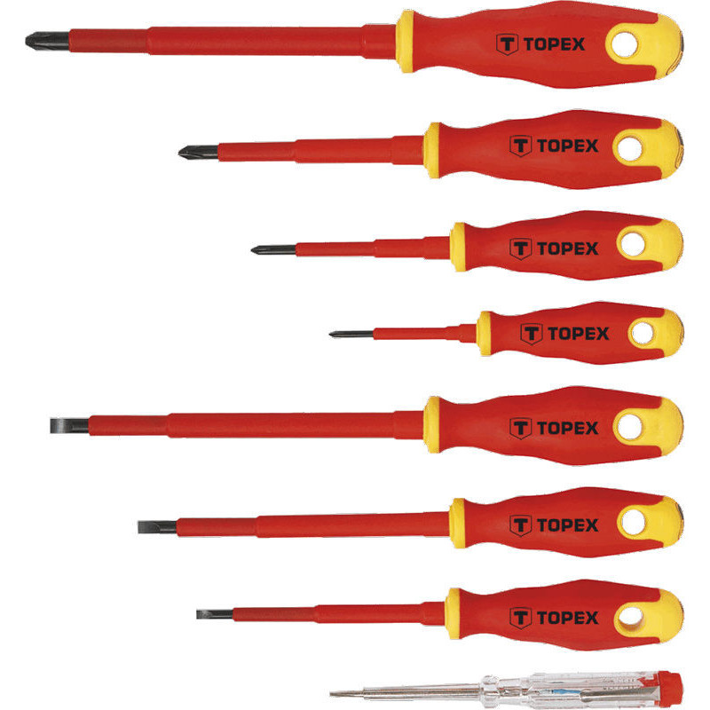 Wkrętaki 1000V, zestaw 8 szt., z certyfikatem, stal CrV, dwumateriałowy uchwyt, rozmiary: 4 x 100 mm, 5.5 x 125 mm, 6.5 x 150 mm, PH0 x 60 mm, PH1 x 80 mm, PH2 x 100 mm, PH3 x 150 mm, próbnik 125- 250V