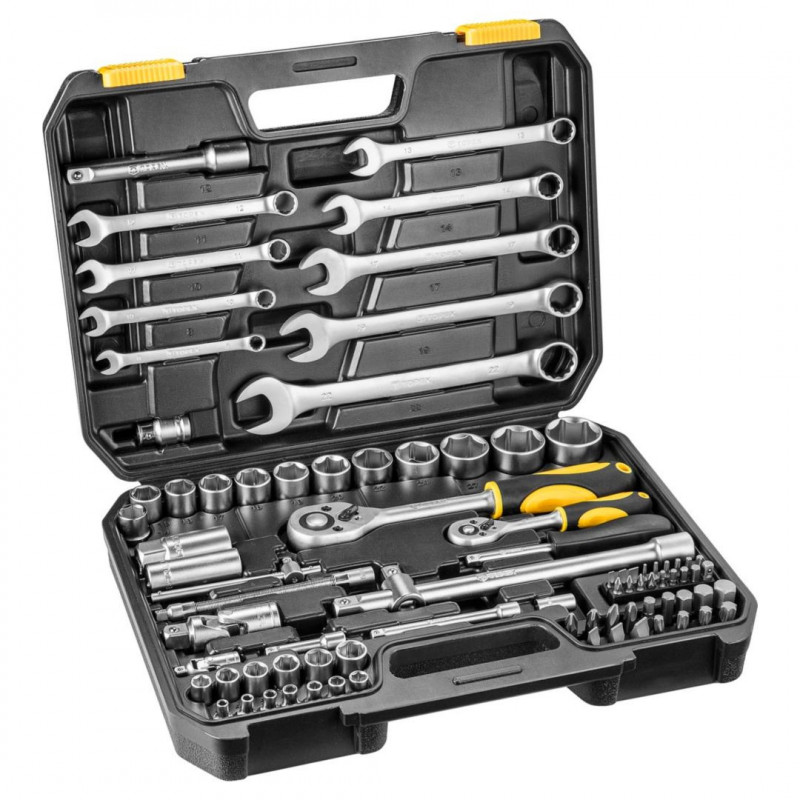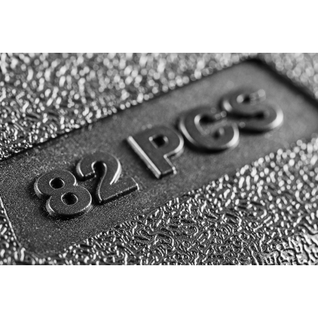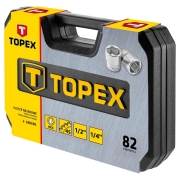 Klucze nasadowe 1/4", 1/2", zestaw 82 szt., nasadki sześciokątne ¼” 13 szt.: 4, 4.5, 5, 5.5, 6, 7, 8, 9, 10, 11, 12, 13, 14 mm; grzechotka ¼” 150 mm, 45 zębów, uchwyt wkrętakowy ¼”, przegub uniwersalny ¼”, przedłużki ¼” 2 szt.: 50 i 100 mm, przedłużka elastyczna ¼” 145 mm, adapter nasadkowy do bitów, pokrętło typu T 110 mm, ¼”; bity ¼” 17 szt.: SL4, SL5.5, SL7, PH1, PH2, PZ1, PZ2, T8, T10, T15, T20, T25, T30, H3, H4, H5, H6; bity 8 mm, 16 szt.: SL8, SL10, SL12, PH3, PH4, PZ3, PZ4, T40, T45, T50, T55, H7, H8, H10, H12, H14; nasadki sześciokątne ½”, 12 szt.: 14, 15, 16, 17, 18, 19, 20, 22, 24, 27, 30, 32 mm, grzechotka ½”, 250 mm 45 zębów; przegub uniwersalny ½”, nasadki do świec ½”, 2 szt.: 16 i 21 mm, adapter 3/8F x ½”M, adapter do bitów 8 mm, adapter do wkrętarki ¼”.
