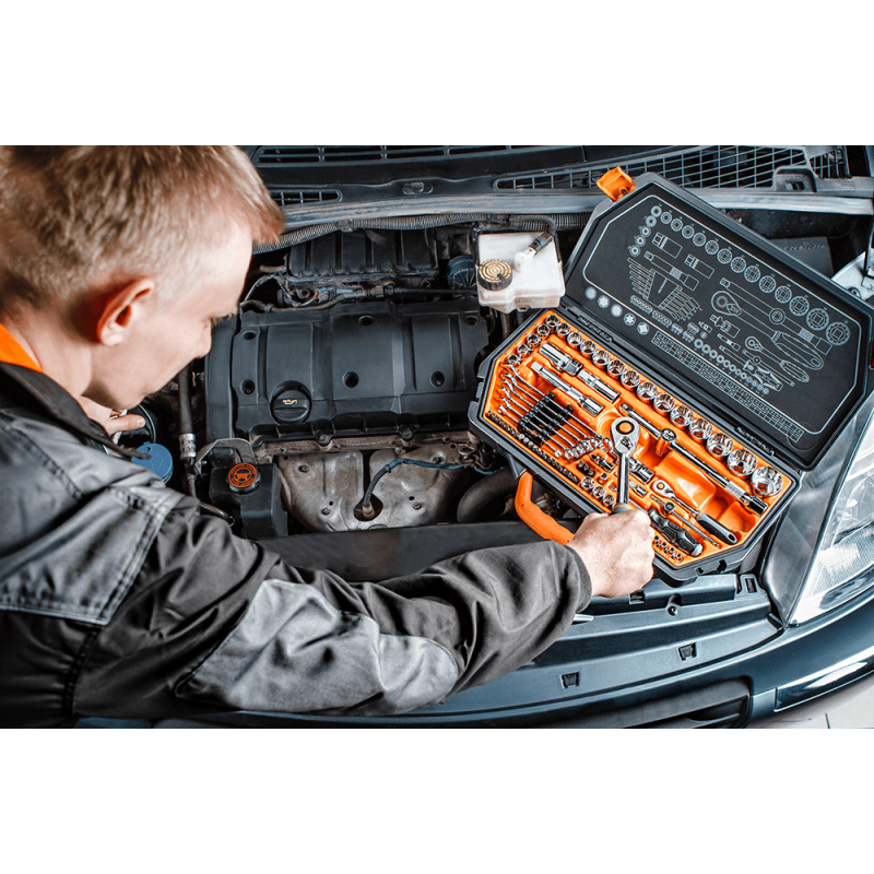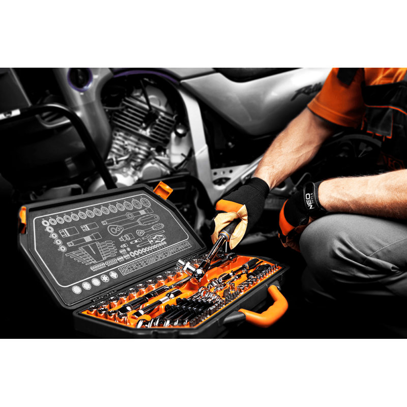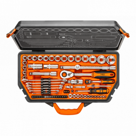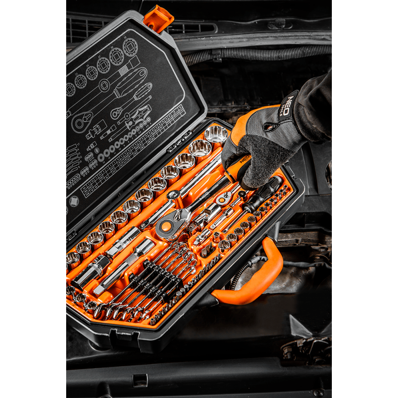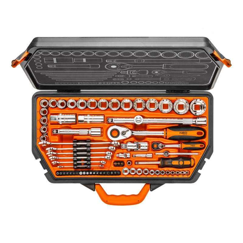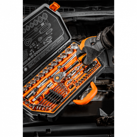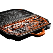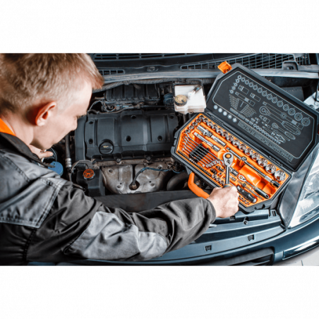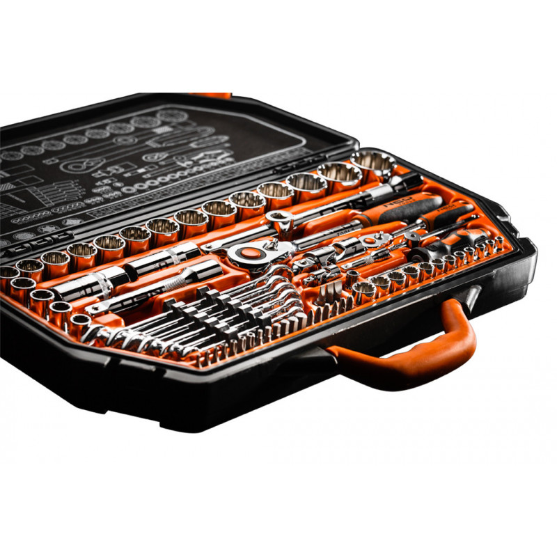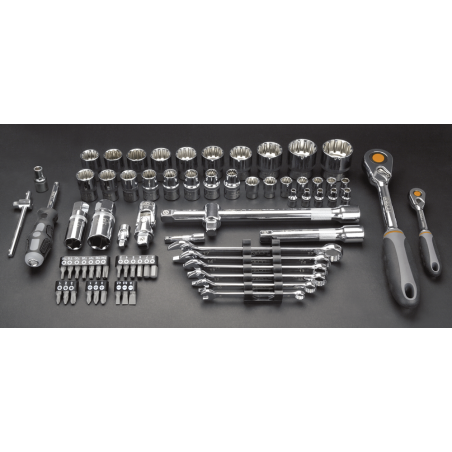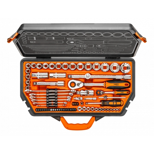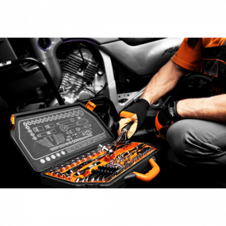 Klucze nasadowe 1/4", 1/2", zestaw 7, 1/4": grzechotka 135 mm, 48 zębów, przełącznik kierunku obrotów, przegub uniwersalny 35 mm, przedłużka 50 mm, adapter do końcówek wkrętakowych, pokrętło z zabierakiem 110 mm, uchwyt wkrętakowy do końcówek 150 mm, 12 szt. nasadek Spline, rozmiary: 4, 4.5, 5, 5.5, 6, 7, 8, 9, 10, 11, 12, 13 mm, 22 szt. końcówek wkrętakowych 25 mm, rozmiary: płaskie 4.5, 6.5, 8 mm, krzyżowe PH1, PH2, PH3, PZ1, PZ2, PZ3, sześciokątne H3, H4, H5, H6, H7, H8, Torx z otworem TT10, TT15, TT20, TT25, TT27, TT30, TT40, 1/2": grzechotka 245 mm, 48 zęby, przełącznik kierunku obrotów, przegub uniwersalny 65 mm, 2 szt. przedłużek 125, 250 mm, redukcja 1/2"M x 3/8"F, pokrętło z zabierakiem 250 mm, 2 szt. nasadek do świec, rozmiary: 16, 21 mm, 18 szt. nasadek Spline, rozmiary: 10, 11, 12, 13, 14, 15, 16, 17, 18, 19, 20, 21, 22, 23, 24, 27, 30, 32 mm, 6 szt. kluczy płasko-oczkowych, rozmiary: 8, 10, 12, 13, 14, 17 mm, stal CrV, końcówki wkrętakowe stal S2, walizka z tworzywa, certyfikat TÜV M+T, 25 lat gwarancji