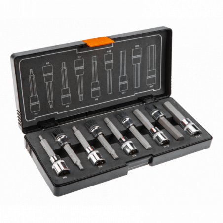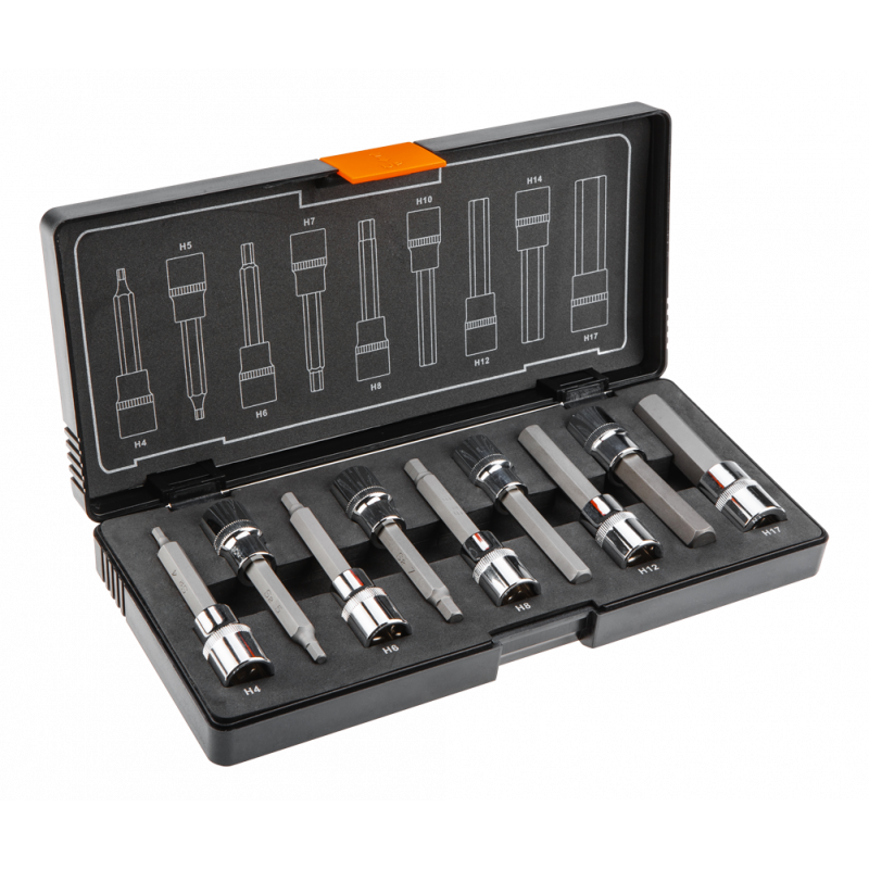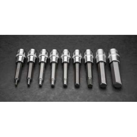 Końcówki sześciokątne na nasadce 100 mm, zestaw 9 szt., 1/2", nasadka ze stali CrV, końcówka ze stali S2, rozmiary: H4, H5, H6, H7, H8, H10, H12, H14, H17, certyfikat TÜV M+T, 25 lat gwarancji