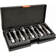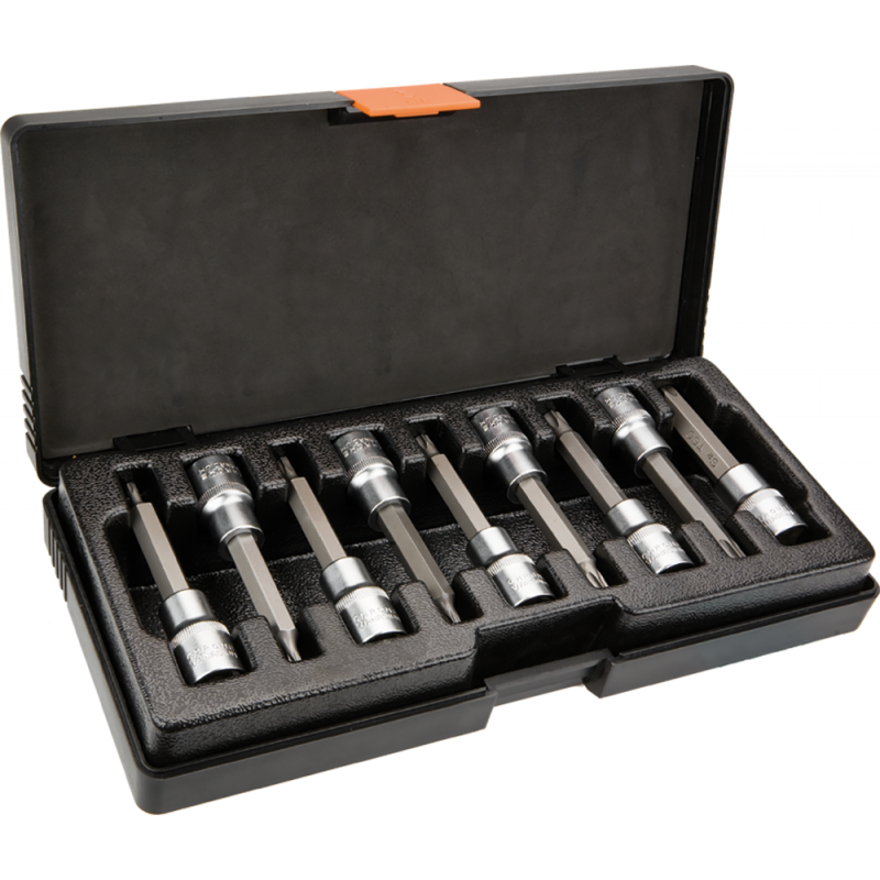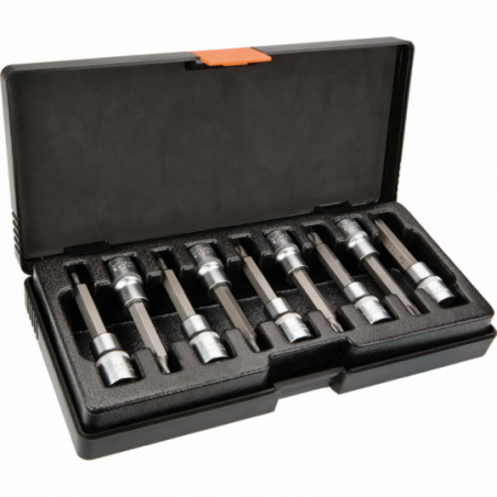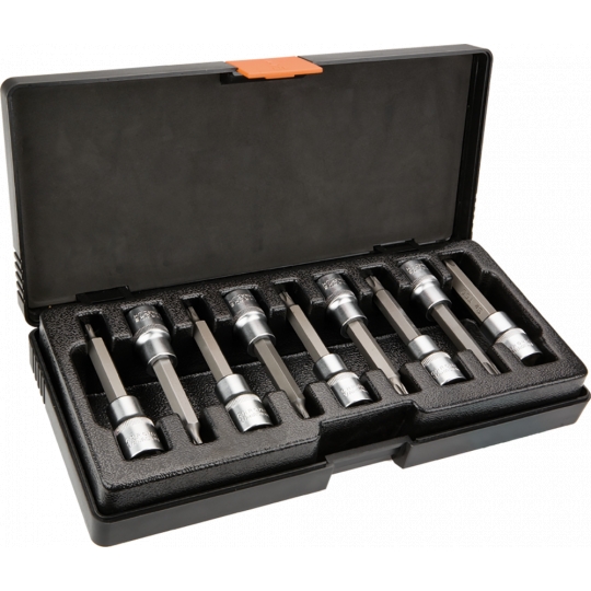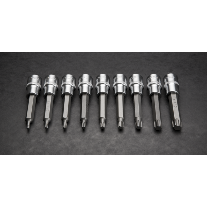 Końcówki Torx na nasadce 100 mm, zestaw 9 szt., 1/2", nasadka ze stali CrV, końcówka ze stali S2, rozmiary: T20, T25, T27, T30, T40, T45, T50, T55, T60, certyfikat TÜV M+T, 25 lat gwarancji