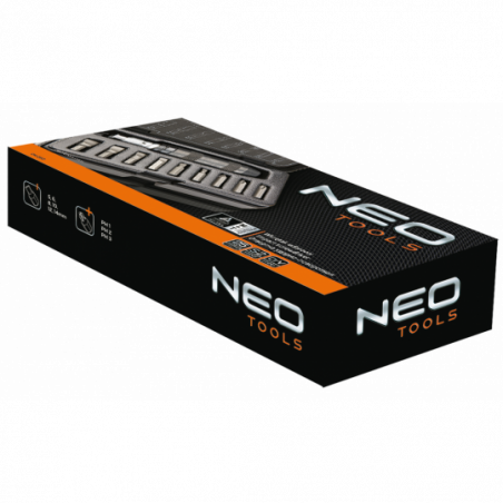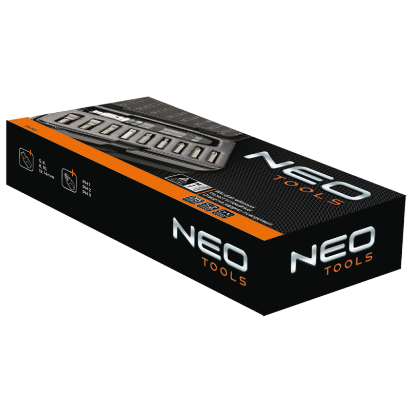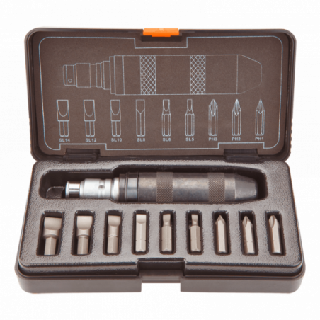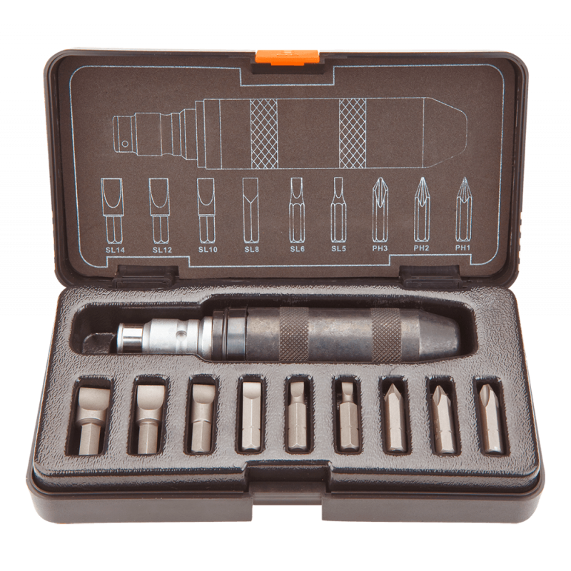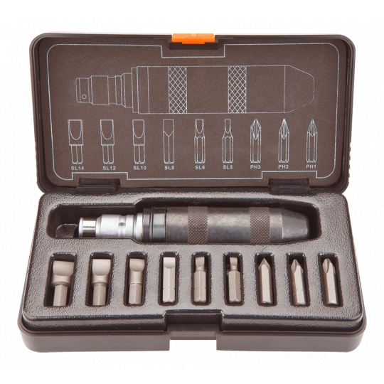 Wkrętak udarowy 1/2", zestaw 1, uchwyt stal CrV, uchwyt do końcówek 5, 16" na kwadrat 1/2", 10 szt. końcówek wkrętakowych, rozmiary: płaskie 5, 6, 8, 10, 12, 14 mm, krzyżowe PH1, PH2, PH3, etui z tworzywa, TÜV