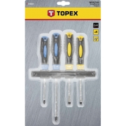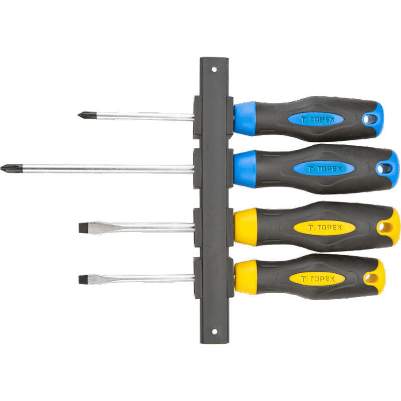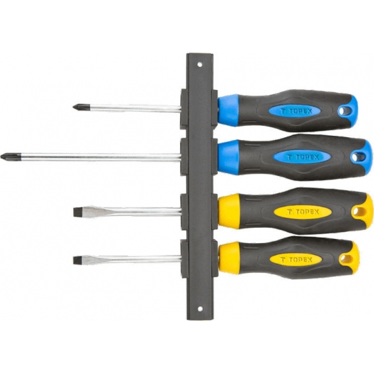 Wkrętaki, zestaw 4 szt., hartowana końcówka, magnetyczna końcówka, stal CrV, dwumateriałowy uchwyt, rozmiary: 5 x 100 mm, 6.5 x 100 mm, PH1 x 100 mm, PH2 x 150 mm, z wieszakiem