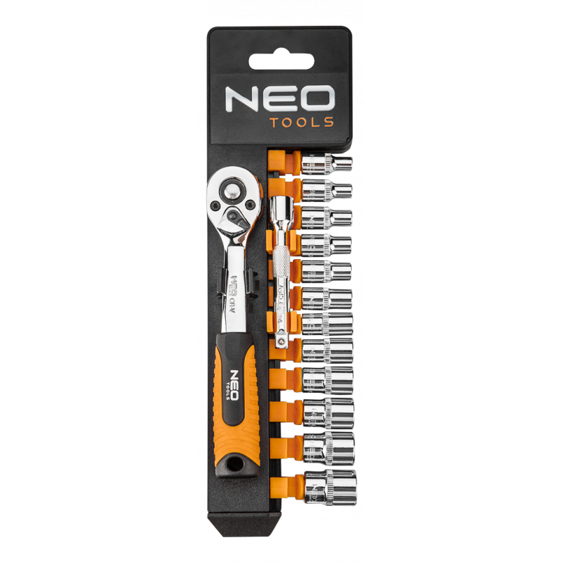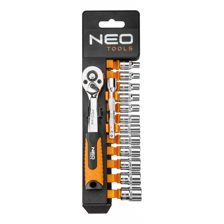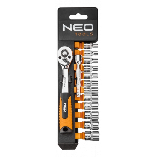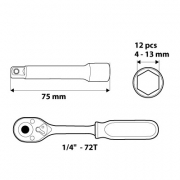 Klucze nasadowe 1/4", zestaw 14 szt., 1/4": grzechotka 135 mm, dwumateriałowy uchwyt, 72 zęby, przełącznik kierunku obrotów, przedłużka 75 mm, 12 szt. nasadek sześciokątnych, rozmiary: 4, 4.5, 5, 5.5, 6, 7, 8, 9, 10, 11, 12, 13 mm, wieszak z tworzywa, certyfikat TÜV M+T, 25 lat gwarancji