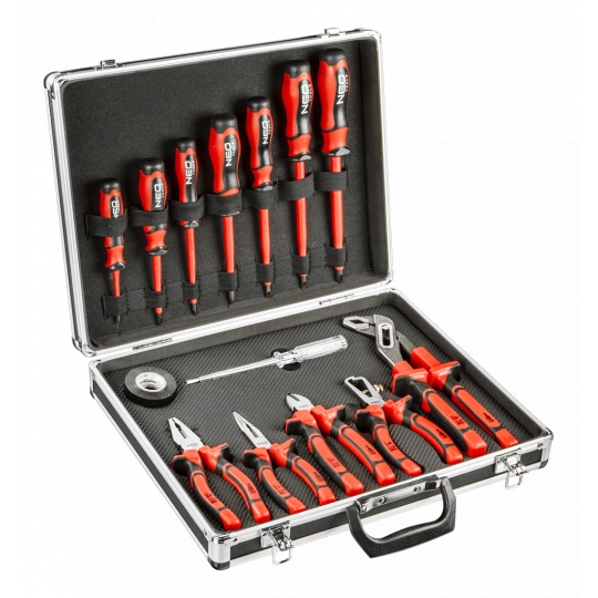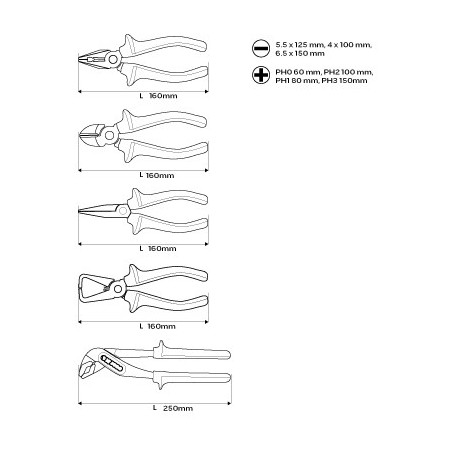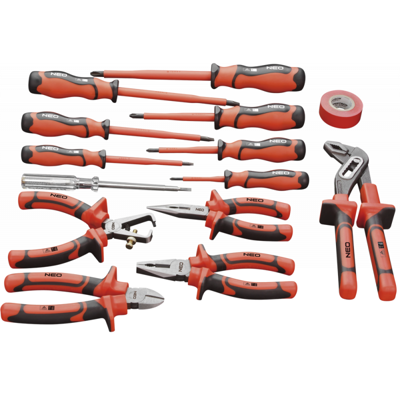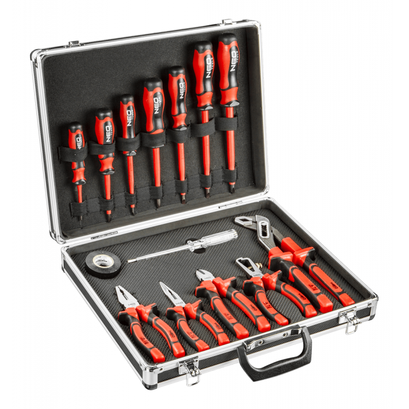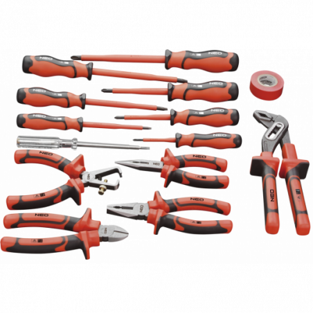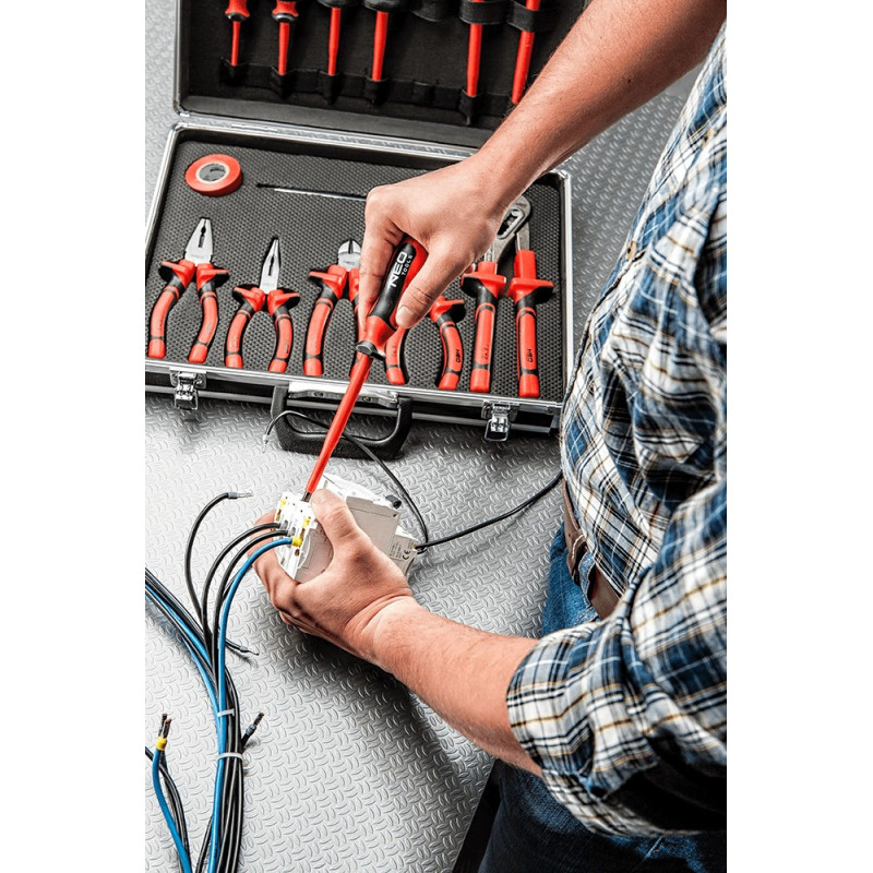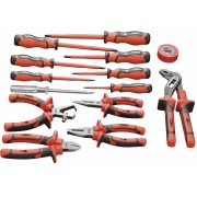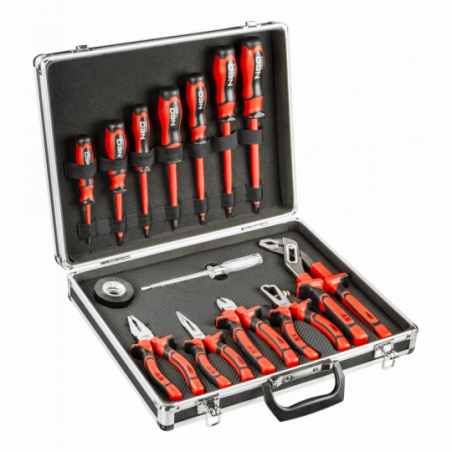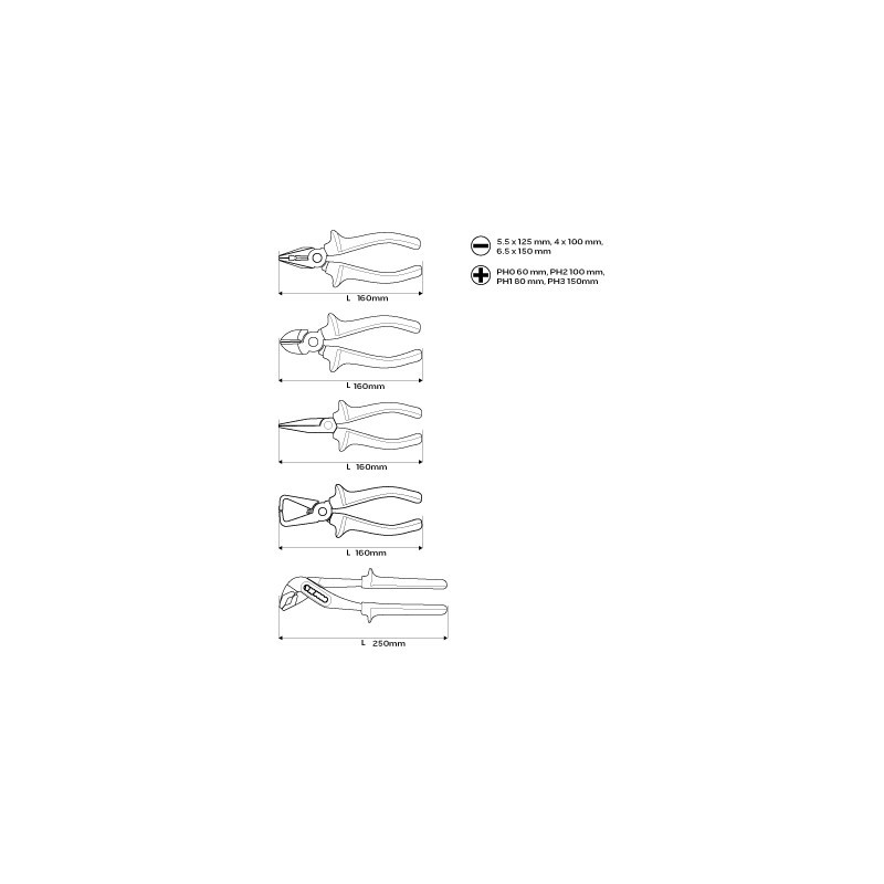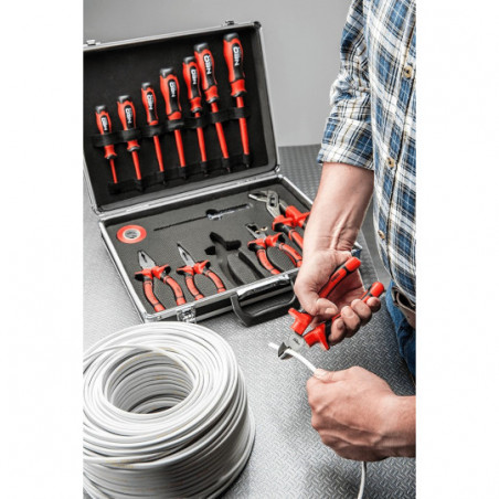 Zestaw szczypiec i wkrętaków 1000V, 13 szt., rękojeść dwumateriałowa, szczypce stal CrV, wkrętaki stal S2, certyfikat TÜV, 7 szt. wkrętaków: PH0*3*60 mm, PH2*6*100 mm, PH1*4.5*80 mm, 1.8*8*175 mm, 1.0*5.5*125 mm, 0.8*4*100 mm, 1.0*6.5*150 mm, 1 szt. 160 mm szczypce uniwersalne1 szt. 160 mm szczypce boczne1 szt. 160 mm szczypce wydłużone1 szt. 160 mm szczypce do izolacji,1 szt. 10"" szczypce do rur,1 szt.190 mm próbnik instalacji elektrycznej