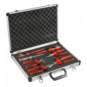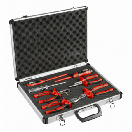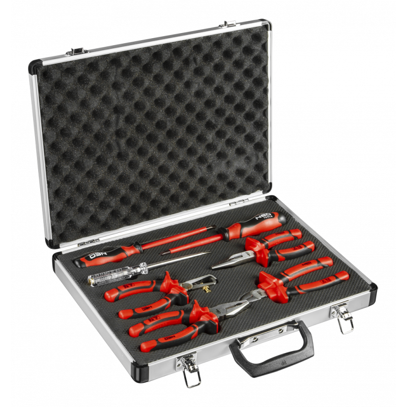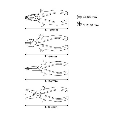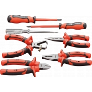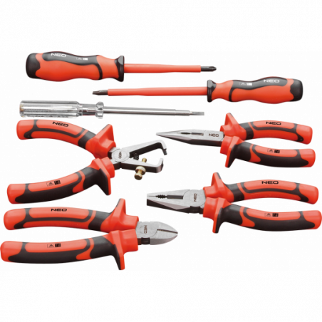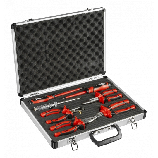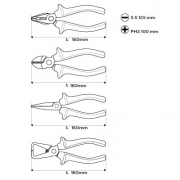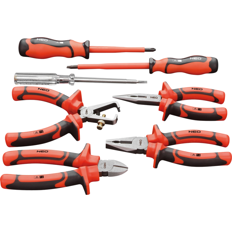 Zestaw szczypiec i wkrętaków 1000V, 7 szt., rękojeść dwumateriałowa, szczypce stal CrV, wkrętaki stal S2, certyfikat TÜV, 2 szt. wkrętaków PH2*6*100 mm, 1.0*5.5*125 mm,1 szt. 160 mm szczypce boczne1 szt. 160 mm szczypce wydłużone1 szt. 160 mm szczypce do zdejmowania izolacji, 1 szt. 160 mm szczypce uniwersalne,1 szt. 190 mm próbnik instalacji elektrycznej