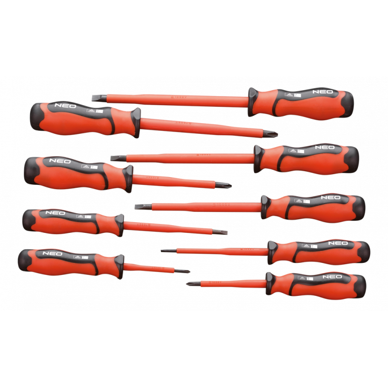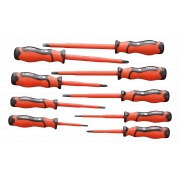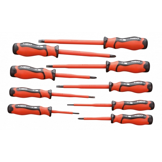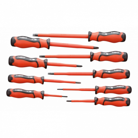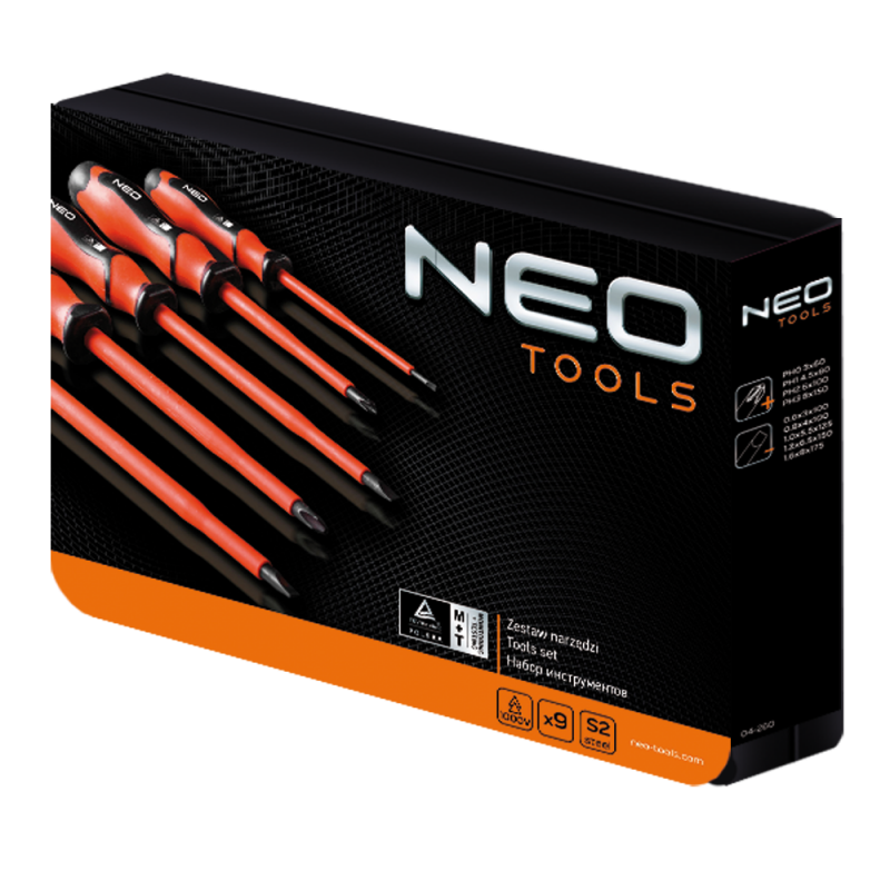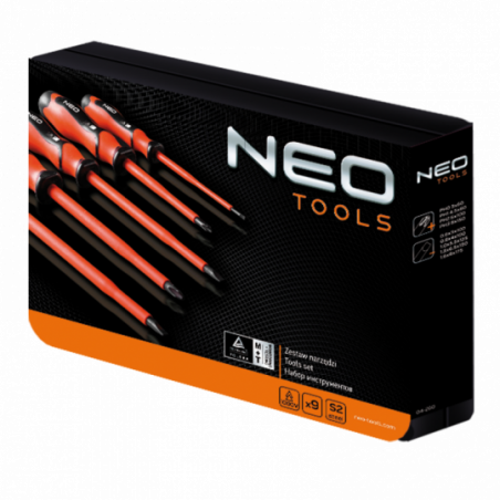Zestaw wkrętaków 1000V, 9 szt., rękojeść dwumateriałowa, wkrętaki stal S2, certyfikat TÜV, płaskie 0.6*3*100, 0.8*4*100, 1.0*5*100, 1.2*6.5*100, 1.6*8*175, PH0*3*60 mm, PH1*4.5*80 mm, PH2*6*100 mm, PH3*8*150 mm