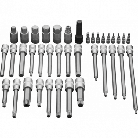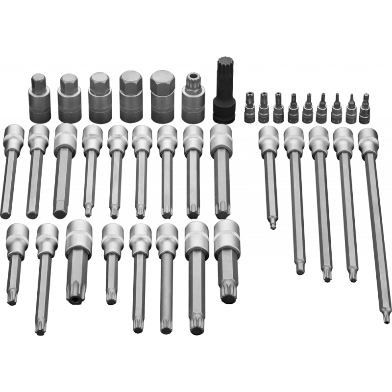 Bity torx 1/2" zestaw 38 szt. 1/2”, 140 mm Torx, T40, T45, T50, T55, T60, T70, T80x100 mm – z otworem, 1/2”, Spline, M9x100 mm, M10x140 mm, M12x140 mm, M14x140 mm, M16x100 mm, 1/2”, Spline, z otworem, (TAMPER PROOF) M16x55 mm, 1/2”, udarowy spline, M18 x 75 mm, 1/2”, Ribe, R7x240 mm, R8x240 mm, R9x100 mm, R10x140 mm, 1/2”, sześciokątna (HEX) z okrągłą główką, H5 x 160 mm, 1/2”, sześciokątna (HEX), H10x140 mm, H11x140 mm, H13x140 mm, H7x230 mm, 1/2”, sześciokątna (HEX) 50 mm, H14, H17, H19, H22, H24, 1/4”, pięciokątna (STAR) z otworem (Tamper Proof), TS10, TS15, TS20, TS25, TS27, TS30, TS40, TS45, TS50, 1/2”, pięciokątna (STAR) z otworem (Tamper Proof), TS30x300 mm, nasadki ze stali CrV, bity ze stali S2, certyfikat TÜV M+T.