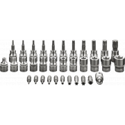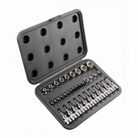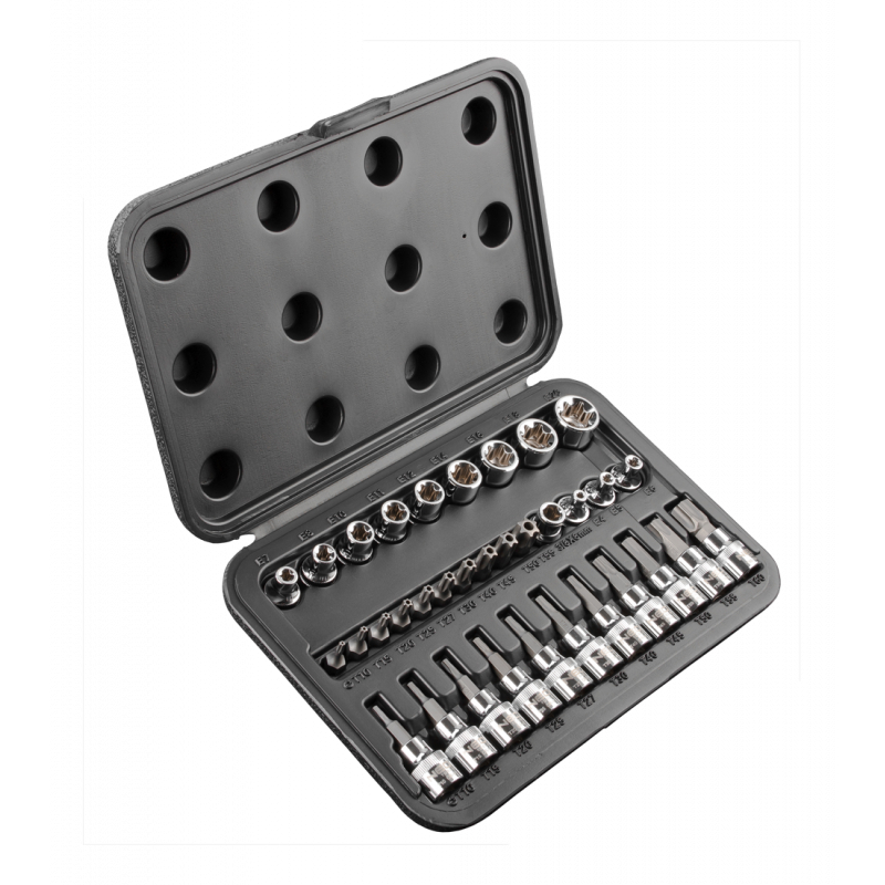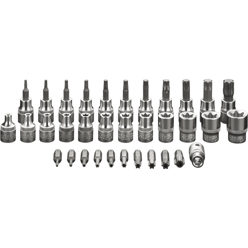 Bity torx 3/8" zestaw 34 szt., nasadki E-Torx: E4-5-6-7-8-10-11-12-14-16-18-20, bity na nasadce Torx: T10-15-20-25-27-30-40-45-50-55-60, bity z otworem Torx (Tamper Proof): T10-15-20-25-27-30-40-45-50-55, adapter do bitów – 8 mm, nasadki ze stali CrV, bity ze stali S2, certyfikat TÜV M+T, 25 lat gwarancji