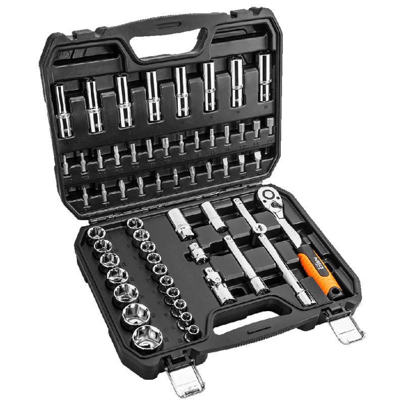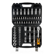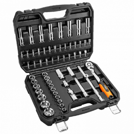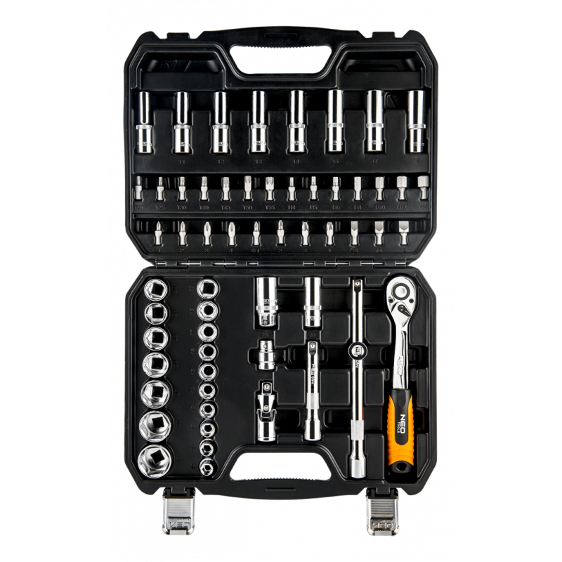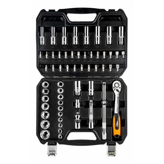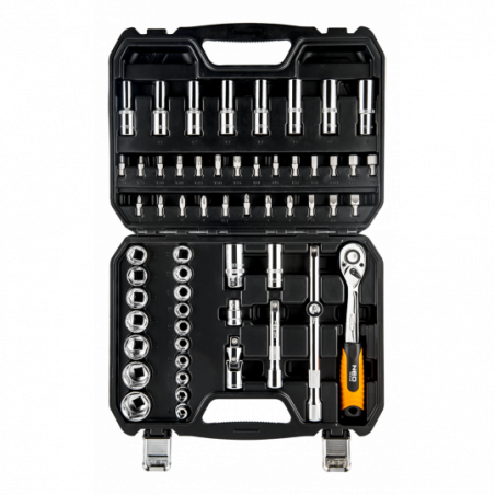 Klucze nasadowe 58 szt., 1/2", stal CrV, nasadki sześciokątne 1/2" 17 szt.: 10, 11, 12, 13, 14, 15, 16, 17, 18, 19, 20, 21, 22, 24, 27, 30, 32 mm, nasadki długie sześciokątne 1/2" 8 szt.: 10, 11, 12, 13, 14, 15, 17, 19 mm, grzechotka 1/2", 72 zęby, przedłużki 1/2" 2 szt.: 125mm i 250 mm, nasadki do świec 1/2" 2 szt.: 16 mm i 21 mm, adapter bitów 1/2" - 5, 16", przegub uniwersalny 1/2", redukcja 1/2", bity 5, 16" 25 szt.: T20, T25, T30, T40, T45, T50, T55, H4, H5, H6, H8, H10, H12, H14, PH1, PH2, PH3, PH4, PZ1, PZ2, PZ3, PZ4, FD8, FD10, FD12, 25 lat gwarancji.
