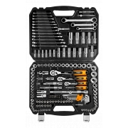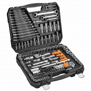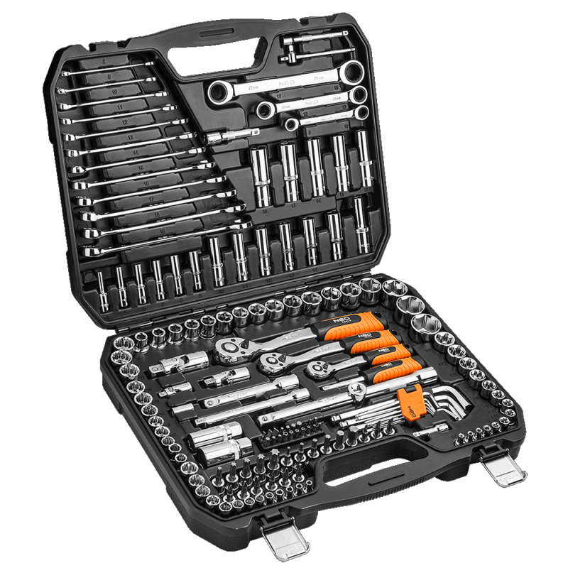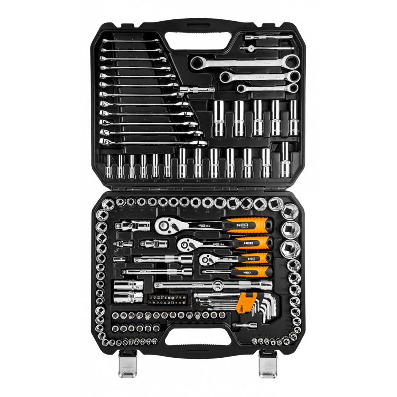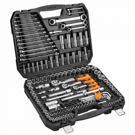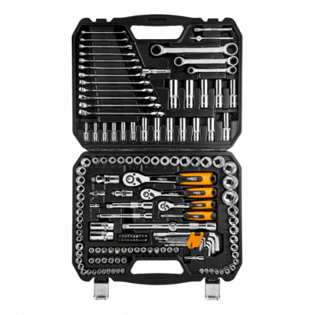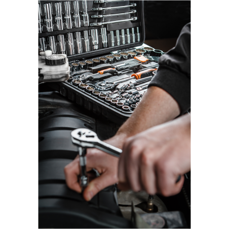Klucze nasadowe 156 szt., 1, 4, 3, 8, 1/2", stal CrV, nasadki sześciokątne 1/2" 17 szt.: 10, 11, 12, 13, 14, 15, 16, 17, 18, 19, 20, 21, 22, 24, 27, 30, 32 mm, nasadki długie sześciokątne 1/2" 6 szt.: 10, 12, 13, 14, 17, 19 mm, grzechotka 1/2", 72 zęby, przedłużki 1/2" 2 szt.: 125 mm i 250 mm, nasadki typu E 1/2" 3 szt.: E20, E22, E24, przegub uniwersalny 1/2", redukcja, 3/8"F X 1/2", nasadki dwunastokątne 3/8" 11 szt. : 9, 10, 11, 12, 13, 14, 15, 16, 17, 18, 19 mm, nasadki długie sześciokątne 3/8" 6 szt.: 10, 11, 12, 13, 14, 15 mm, grzechotka 3/8", 72 zęby, nasadki typu E 3/8" 6 szt.: E10, E11, E12, E14, E16, E18, przegub uniwersalny 3/8", przedłużki 3/8" 2 szt.: 75 mm i 150 mm, nasadki do świec 3/8" 2 szt.: 16 mm i 21 mm, bity na nasadkach 3/8" 20 szt.: PH1, PH2, PH3, T30, T40, T45, T50, T55, H3, H4, H5, H6, H8, H10, PZ1, PZ2, PZ3, FD4, FD5.5, FD6.5, nasadki dwunastokątne 1/4" 13 szt.: 4, 4.5, 5, 5.5, 6, 7, 8, 9, 10, 11, 12, 13, 14 mm, nasadki długie sześciokątne 1/4" 6 szt.: 4, 5, 6, 7, 8, 9 mm, nasadki typu E 1/4" 5 szt.: E4, E5, E6, E7, E8, grzechotka 1/4", 72 zęby; przegub uniwersalny 1/4", przedłużki 1/4" 2 szt.: 50 mm i 100 mm, pokrętło typu T 1/4", adapter do bitów 1/4", wkrętak do bitów 1 szt., bity 20 szt.: T10H, T15H, T20H, T25H, T27H, T30H, T40H, ST20, ST25, ST30, HEX3, HEX4, HEX5, HEX6, FD4, FD5.5, FD7, PH1, PH2, PH3, klucze sześciokątne 9 szt.: 1.5, 2, 2.5, 3, 4, 5, 6, 8, 10 mm, klucze płasko-oczkowe 12 szt.: 8, 9, 10, 11, 12, 13, 14, 15, 16, 17, 18, 19 mm, klucze oczkowe z grzechotką 8x10 mm, 12x13 mm, 17x19 mm, 25 lat gwarancji.