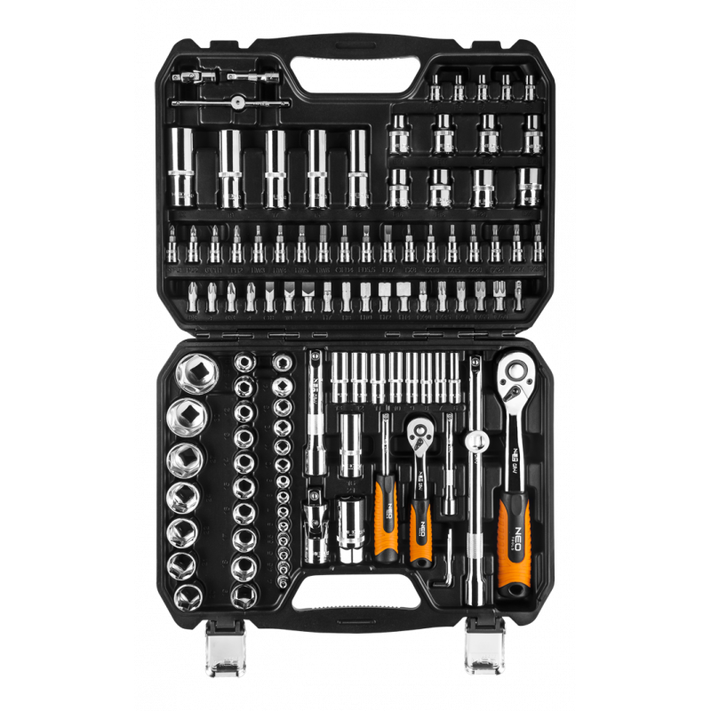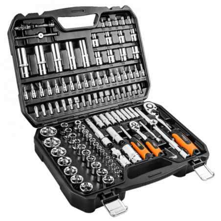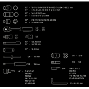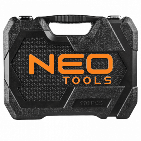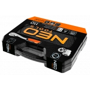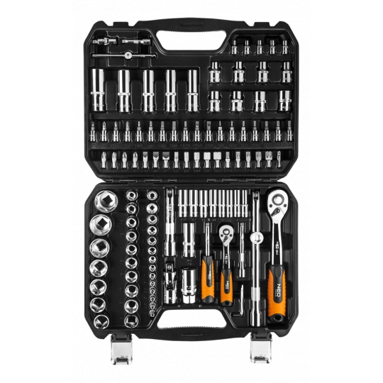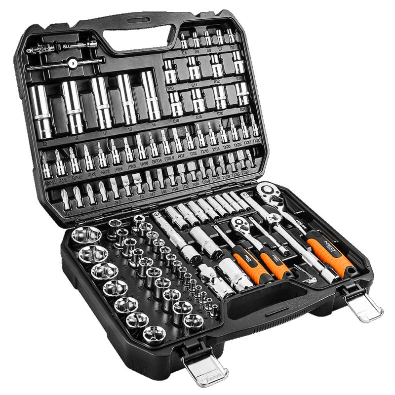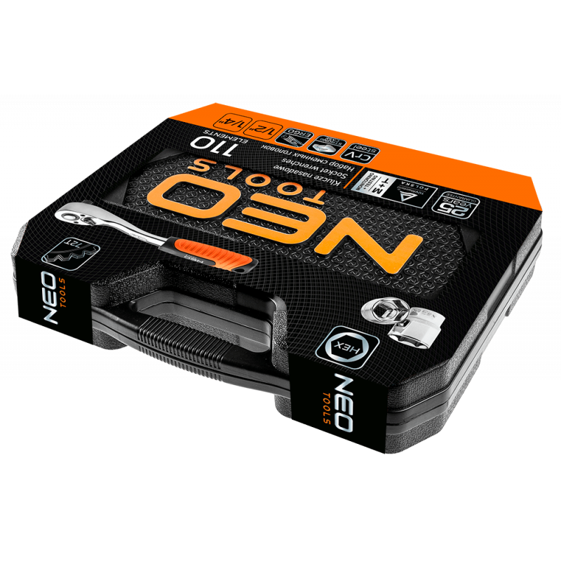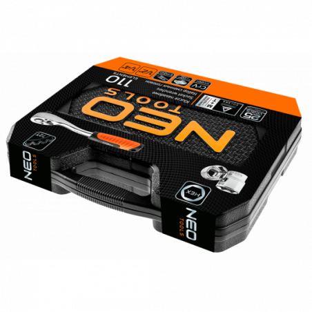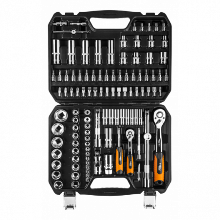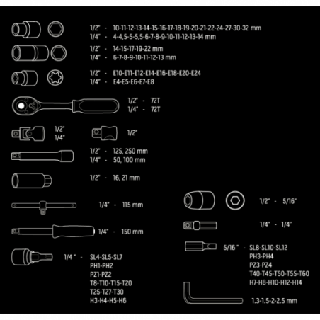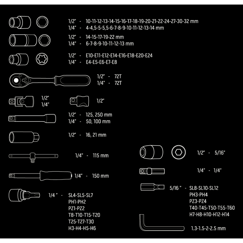 Klucze nasadowe 110 szt., 1/4", 1/2", stal CrV, nasadki sześciokątne 1/2" 17 szt.: 10, 11, 12, 13, 14, 15, 16, 17, 18, 19, 20, 21, 22, 24, 27, 30, 32 mm, nasadki długie 1/2" 5 szt.: 14, 15, 17, 19, 22 mm, nasadki Torx 1/2" 8 szt.: E10, E11, E12, E14, E16, E18, E20, E24, grzechotka 1/2", 72 zęby, pokrętło typu T 1/2", przedłużki 1/2" 2 szt.: 125 mm i 250 mm, nasadki do świec 1/2", adapter bitów 5, 16", przegub 1/2", nasadki sześciokątne 1/4" 13 szt.: 4, 4.5, 5, 5.5, 6, 7, 8, 9, 10, 11, 12, 13, 14 mm, nasadki sześciokątne 1/4" 8 szt.: 6, 7, 8, 9, 10, 11, 12, 13 mm, nasadki Torx 1/4" 5 szt.: E4, E5, E6, E7, E8, grzechotka 1/4", 72 zęby, uchwyt do bitów 1/4", pokrętło typu T 1/4", przedłużki 1/4" 2 szt.: 50 mm i 100 mm, przegub 1/4", nasadki 1/4" 18 szt.: T8, T10, T15, T20, T25, T27, T30, H3, H4, H5, H6 mm, PH1, PH2, PZ1, PZ2, SL4, SL5, SL7, bity 5, 16" 17 szt.: T40, T45, T50, T55, T60 H7, H8, H10, H12, H14 mm, PH3, PH4, PZ3, PZ4, 8, 10, 12 mm, klucze sześciokątne 4 szt.: 1.3, 1.5, 2, 2.5 mm, 25 lat gwarancji. Certyfikat TÜV Rheinland M+T.