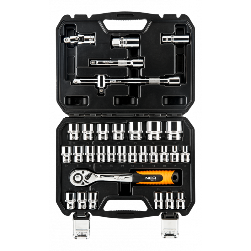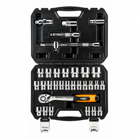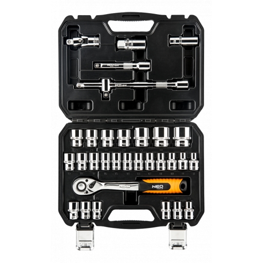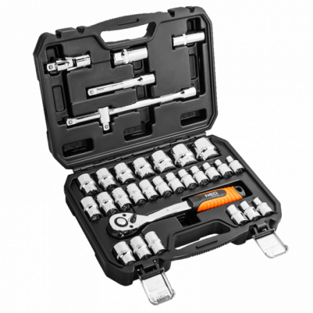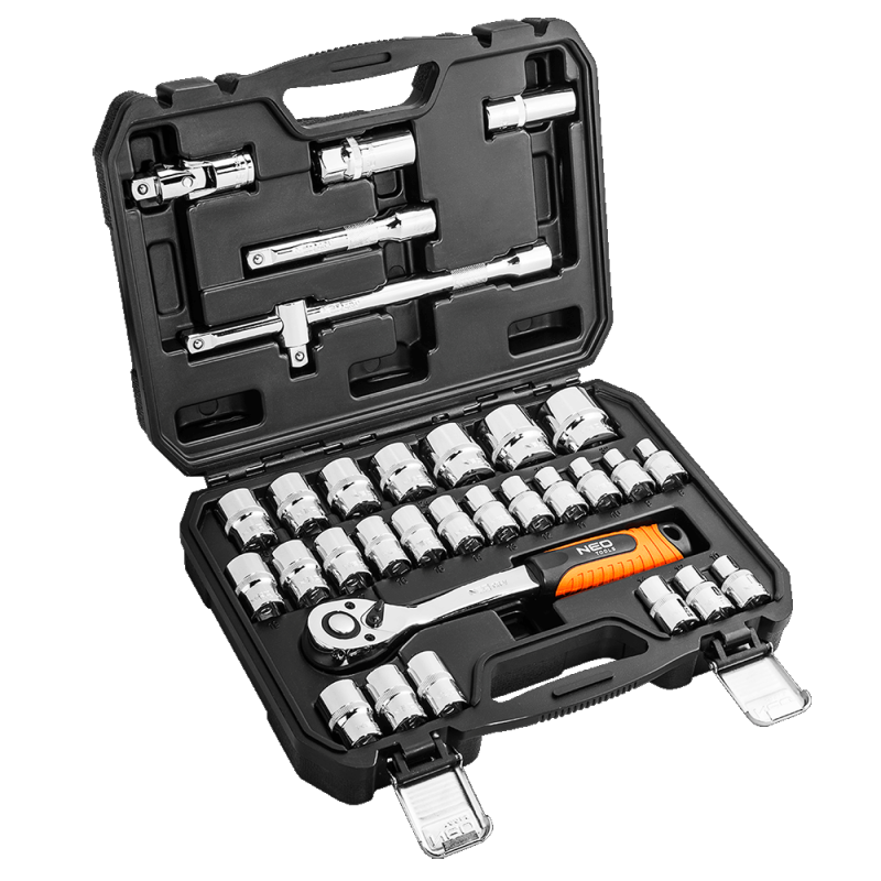 Klucze nasadowe 32 szt., 1/2" stal CrV, nasadki sześciokątne 1/2", 19 szt.: 8, 9, 10, 11, 12, 13, 14, 15, 16, 17, 18, 19, 20, 21, 22, 24, 27, 30, 32 mm, nasadki dwunastokątne 1/2" 6 szt.: 10, 12, 14, 15, 17, 19 mm, grzechotka 1/2", 72 zęby, przedłużki 1/2" 2 szt.: 125mm i 250mm, przegub uniwersalny 1/2", redukcja 1/2", nasadki do świec 1/2" 2 szt.: 16 mm i 21 mm, 25 lat gwarancji.
