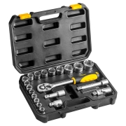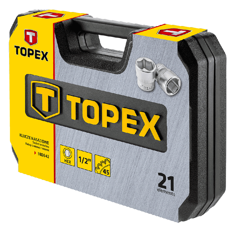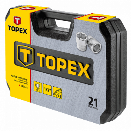 Klucze nasadowe 21 szt., 1/2", nasadki sześciokątne 1/2" 16 szt.: 10, 11, 12, 13, 14, 15, 16, 17, 18, 19, 21, 22, 24, 27, 30, 32 mm, przedłużki 1/2" 2 szt.: 75 mm i 125 mm, grzechotka 1/2" 45T, przegub uniwersalny 1/2", redukcjs 3/8"F x 1/2"M