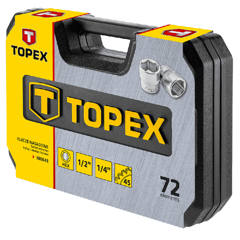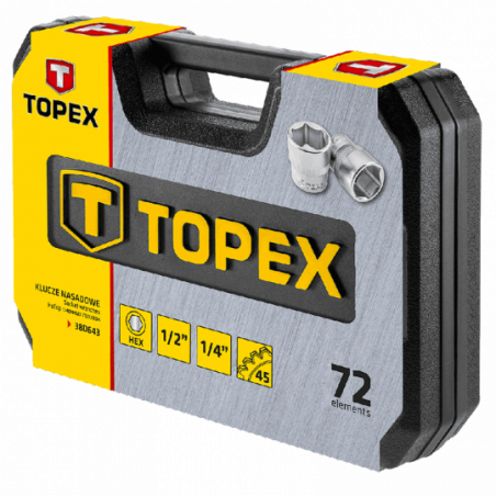 Klucze nasadowe 72 szt., 1/2", 1/4"; nasadki sześciokątne 1/2" 16 szt.: 10, 11, 12, 13, 14, 15, 16, 17, 18, 19, 20, 21, 22, 23, 24, 27 mm, nasadki sześciokątne 1/4" 10 szt.: 4, 5, 5.5, 6, 7, 8, 10, 11, 12, 13 mm; końcówki wkrętakowe 33 szt.: 4 mm, 5.5 mm, 7 mm, PH0, PH1, PH2, PH3, PZ1, PZ2, PZ3, T6, T10, T15, T20, T25, T27, T30, T40, H3, H4, H5, H6, H8, H10, H1/8", H9/64", H5/32", H3/16", H7/32", H1/4", H5/16", M6, M8; klucze sześciokątne 3 szt.: 1.5, 2, 2.5 mm, przedłużka 1/2", 2 szt.: 125 mm and 250 mm, przedłużka 1/4" 100 mm, grzechotka 1/2" 45T, grzechotka 1/4" 45T, uchwyt do bitów 150 mm, nasadka do świec 1/2" 21 mm, przegub uniwersalny 1/2", adapter do bitów 1/4", redukcja 3/8"F x 1/2"M
