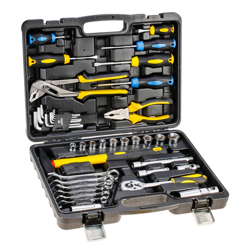 Zestaw narzędzi 41 szt. klucze płasko-oczkowe: 8, 10, 12, 13, 15, 17 mm, wkrętaki: PH2 x 38 mm, PH2 x 100 mm, płaski 5.5 x 100 mm, PH2 x 200 mm, płaski 5.5 x 38 mm, szczypce uniwersalne 160 mm, szczypce do rur 8", grzechotka 3/8", nasadki 3/8": 8, 10, 13, 15, 17, 19, 22, 24, 27, 30 mm, klucze sześciokątne 9 szt., przegub uniwersalny 3/8", nasadka do świec 16 mm, przedłużna 3/8" x 100 mm, młotek 400g