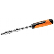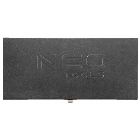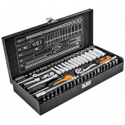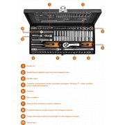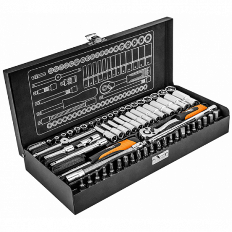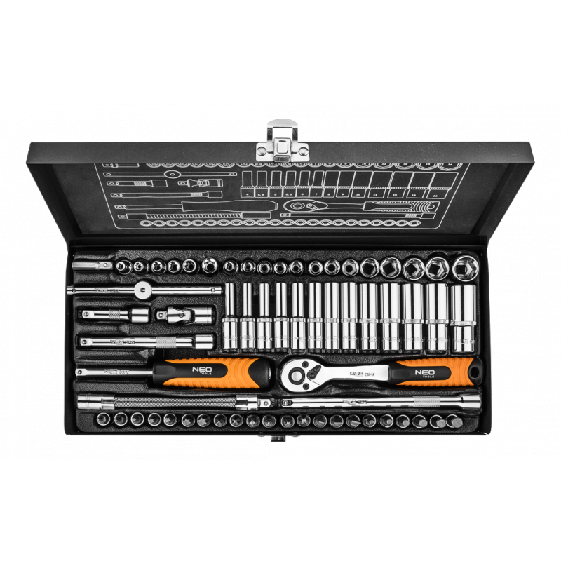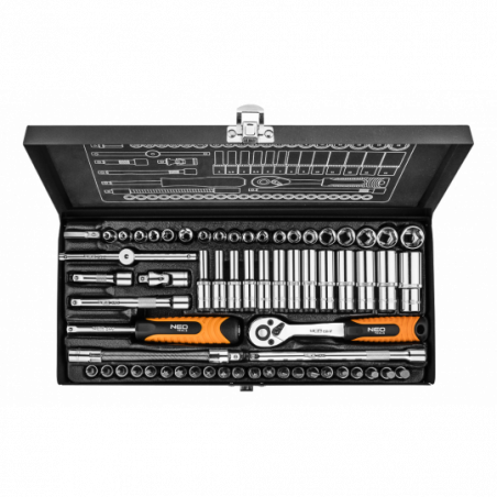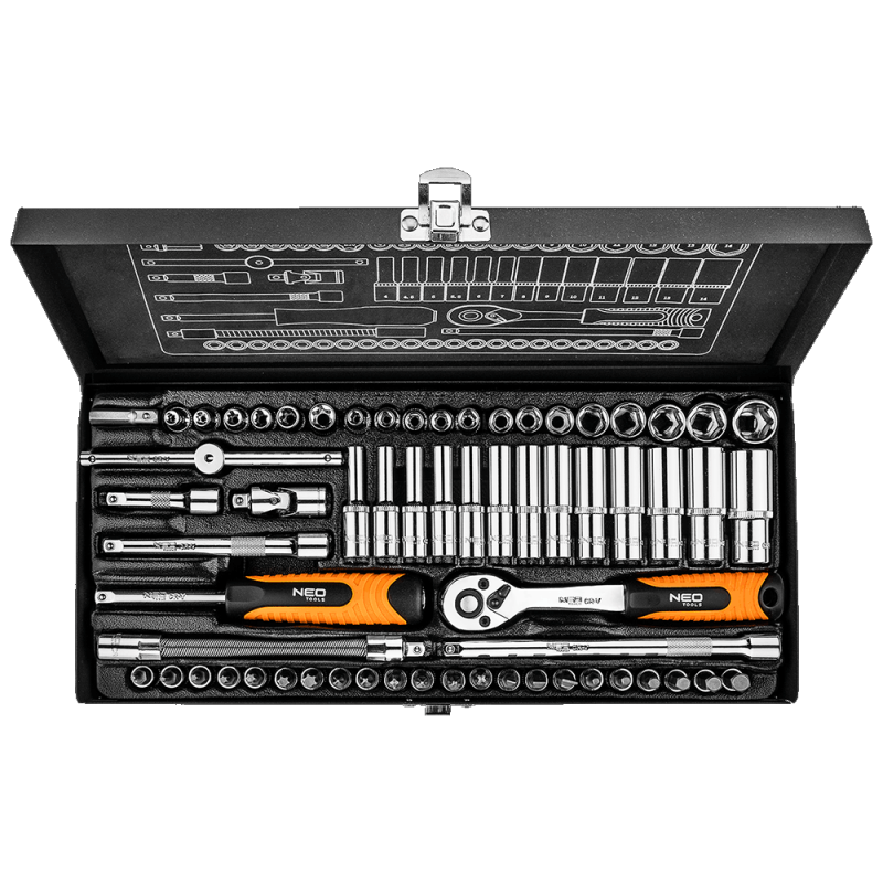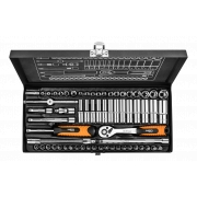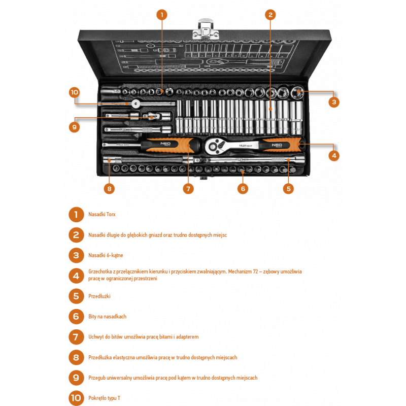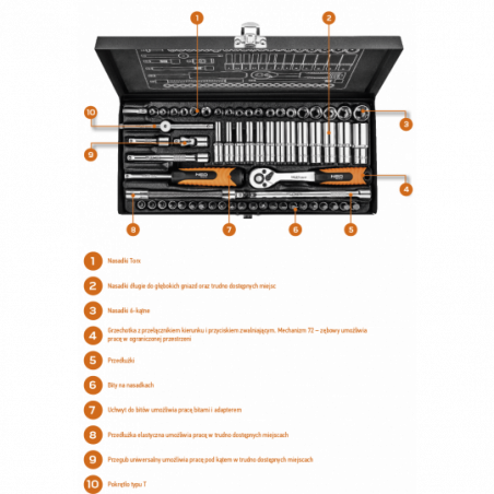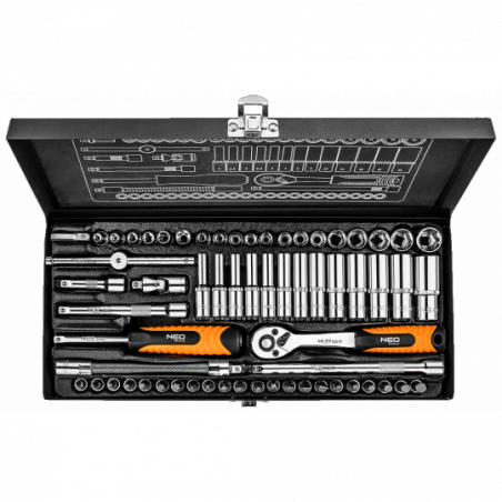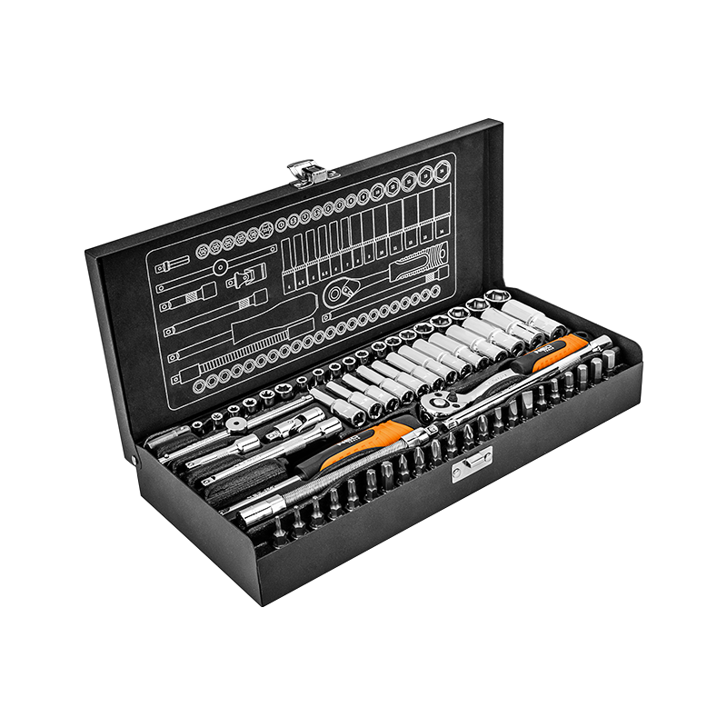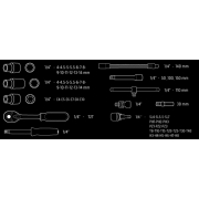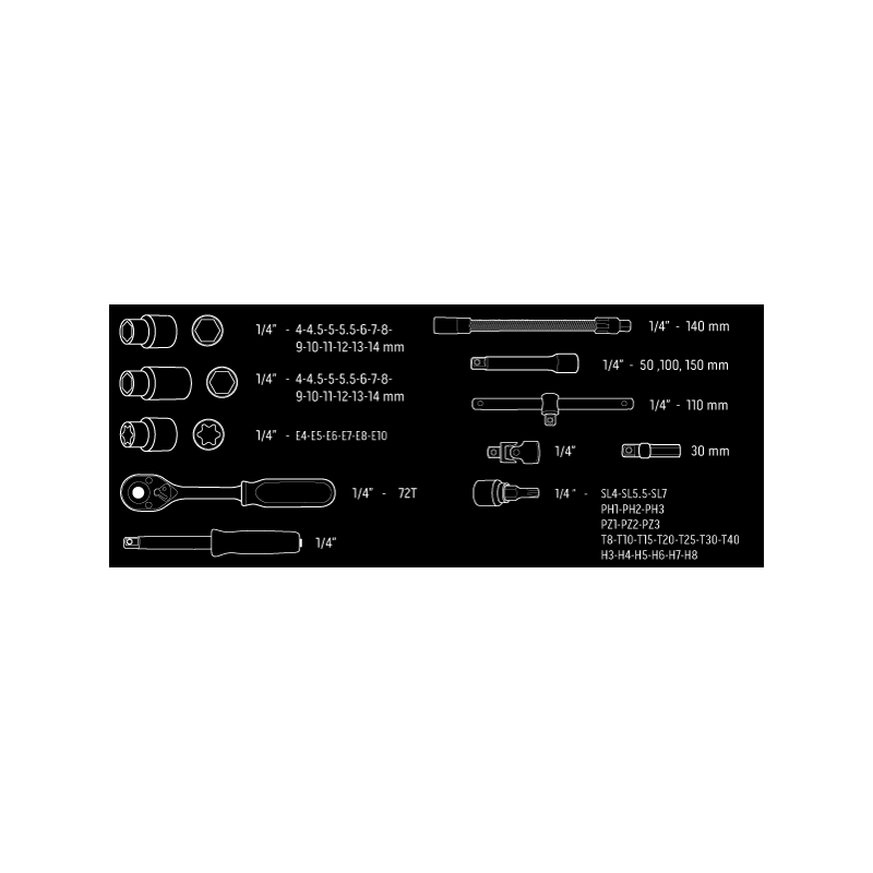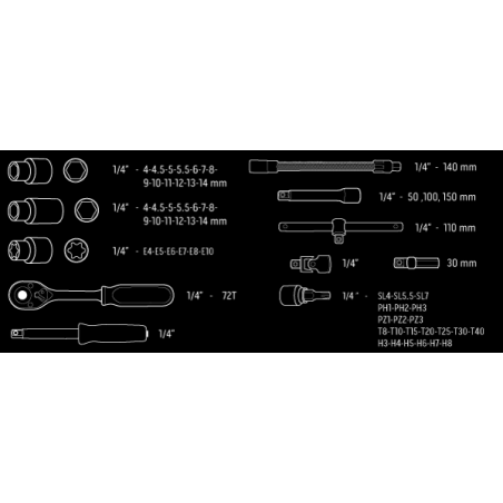 Klucze nasadowe 63 szt., 1/4"; stal CrV; nasadki sześciokątne 1/4" 13 szt.: 4, 4.5, 5, 5.5, 6, 7, 8, 9, 10, 11, 12, 13, 14 mm; nasadki sześciokątne 1/4" długie, 13 szt.: 4, 4.5, 5, 5.5, 6, 7, 8, 9, 10, 11, 12, 13, 14 mm; nasadki typu E 6 szt.: E4, E5, E6, E7, E8, E10; przedłużki 1/4” 3 szt.: 50 mm, 100 mm, 150 mm; przedłużka elastyczna 1/4”, 140 mm; pokrętło typu T 1/4” 110 mm; przegub uniwersalny 1/4”; uchwyt wkrętakowy 1/4”; bity na nasadkach 1/4”, 22 szt.: SL4, SL5.5, SL7, PZ1, PZ2, PZ3, PH1, PH2, PH3, T8, T10, T15, T20, T25, T30, T40, H3, H4, H5, H6, H7, H8; grzechotka 1/4”, 72 zęby; adapter do wkrętarki. Certyfikat TÜV Rheinland M+T. 25 lat gwarancji.